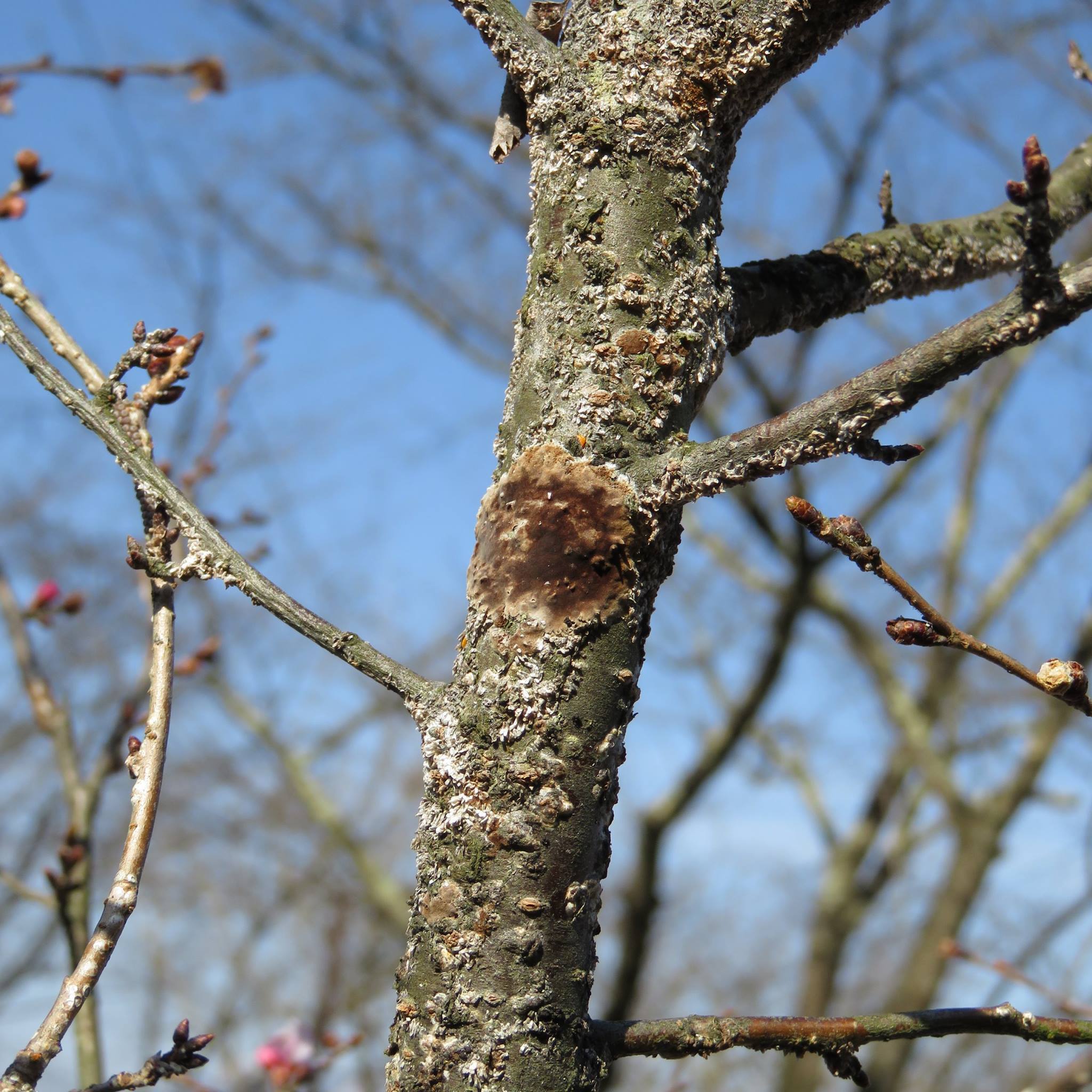 (樹皮表面に寄生したカイガラムシが原因で発生する病気。枝や幹に毛足の短い敷物状のカビが生る)
