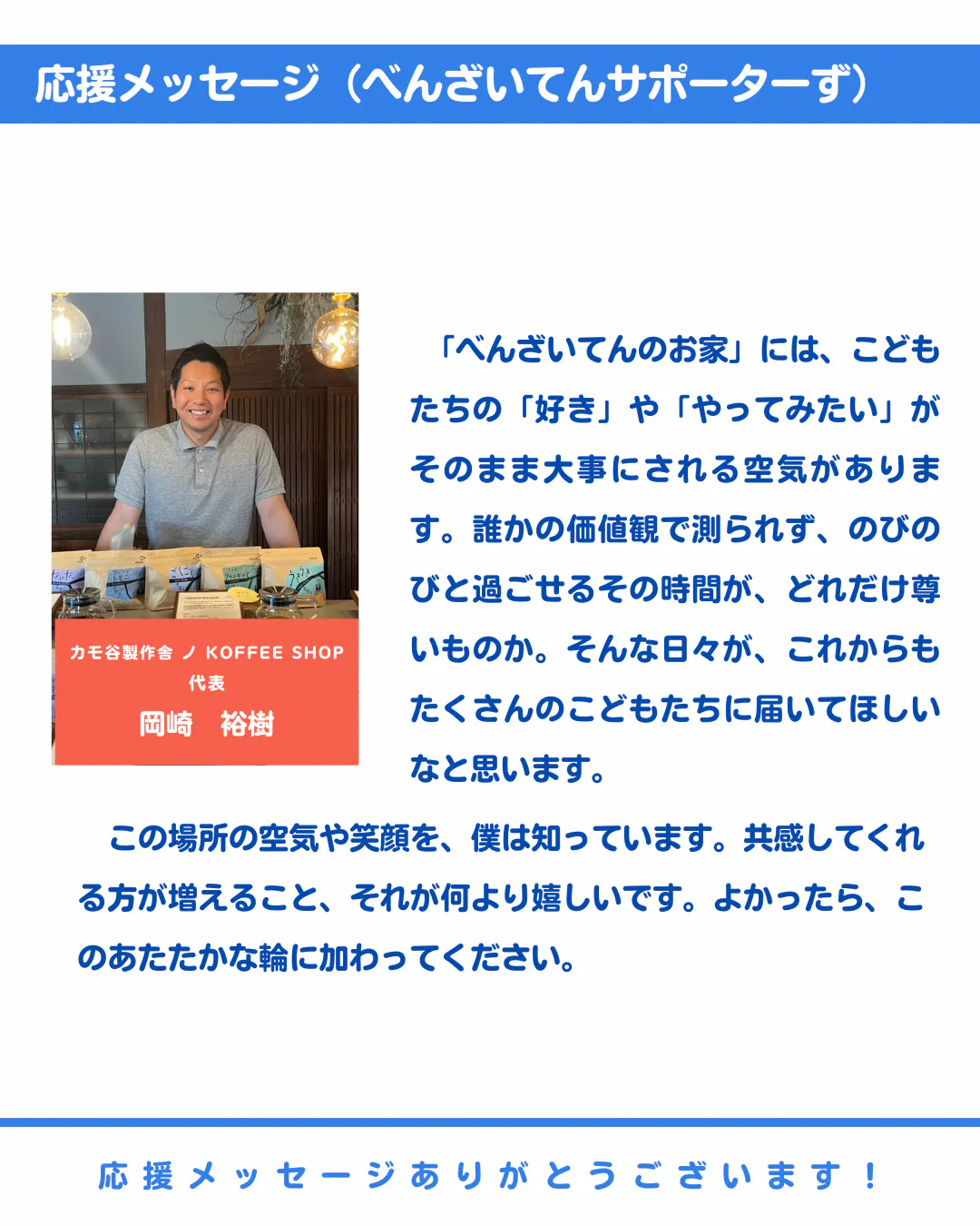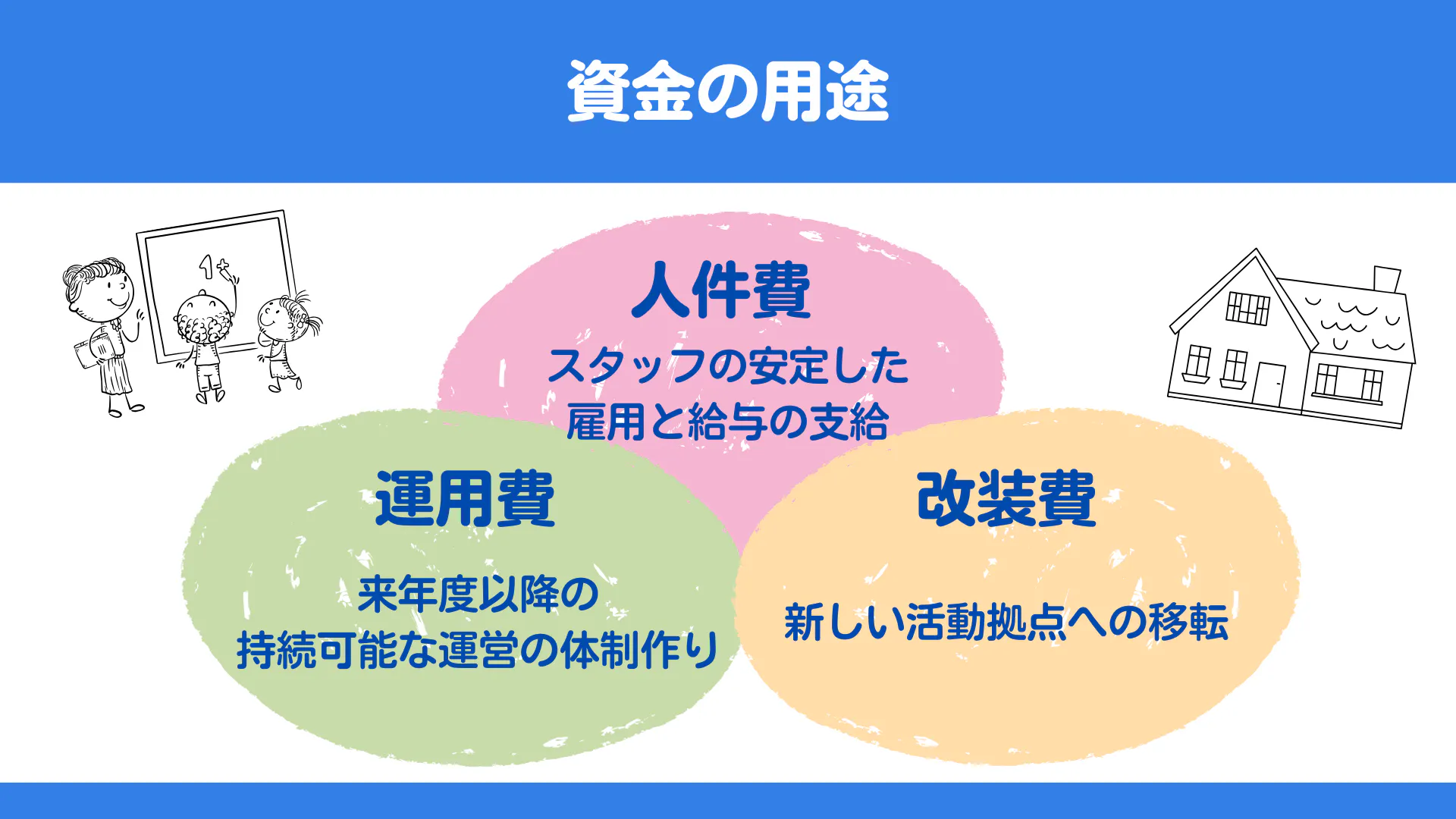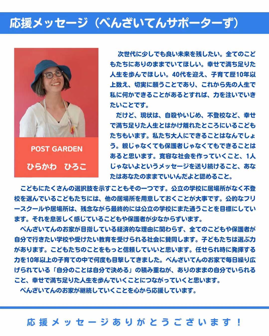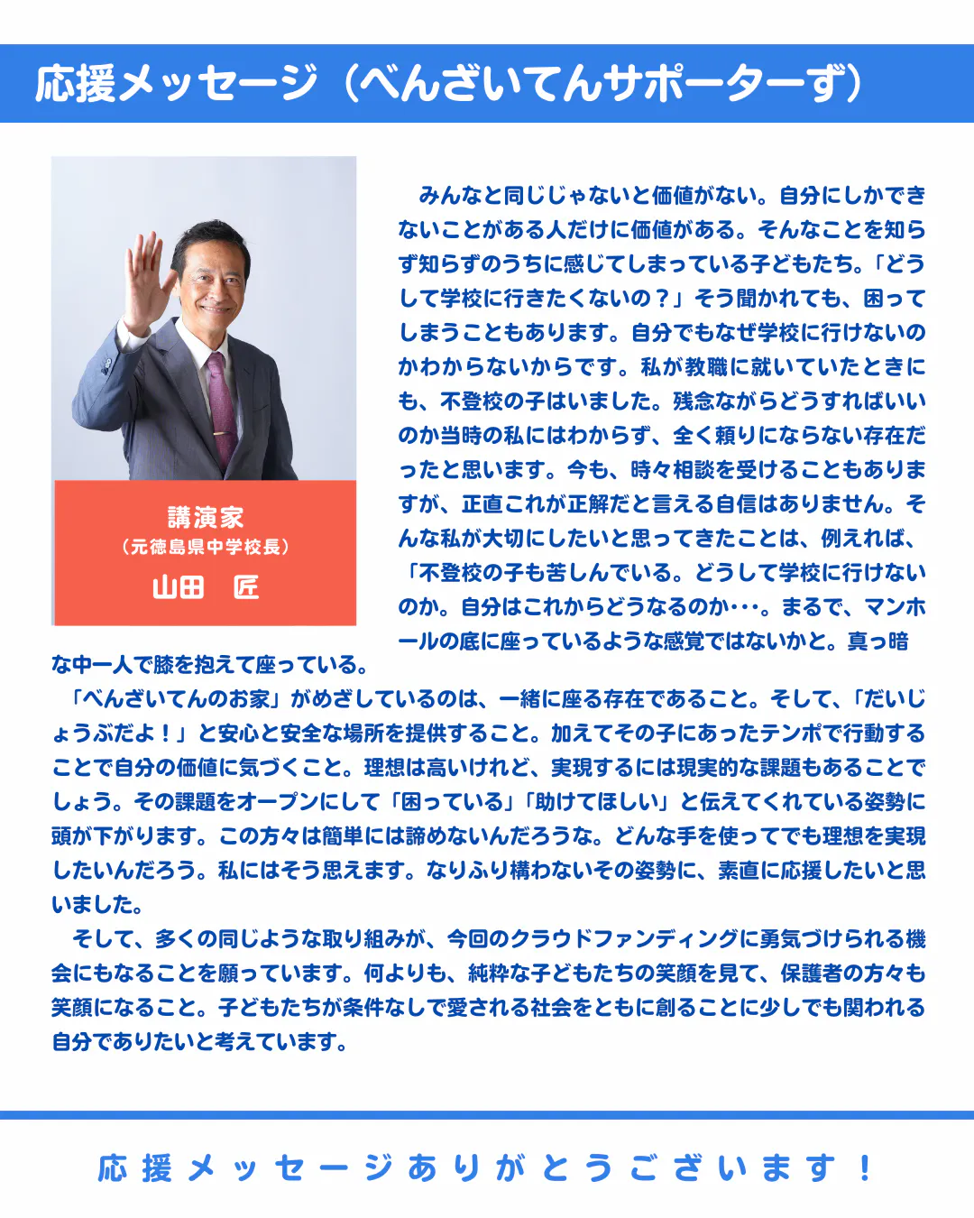 今日は私が運営する『べんざいてんのお家』の学校の継続のために、みなさんのお力を借りたいです。