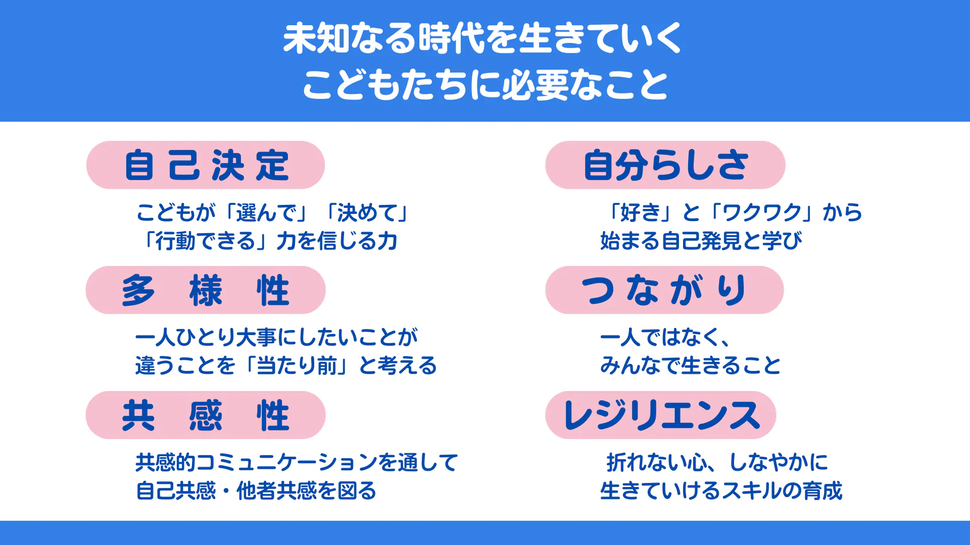 具体的にはこれらの力が、未知なる時代を生きていくこどもたちに必要だと私たちは考えています。