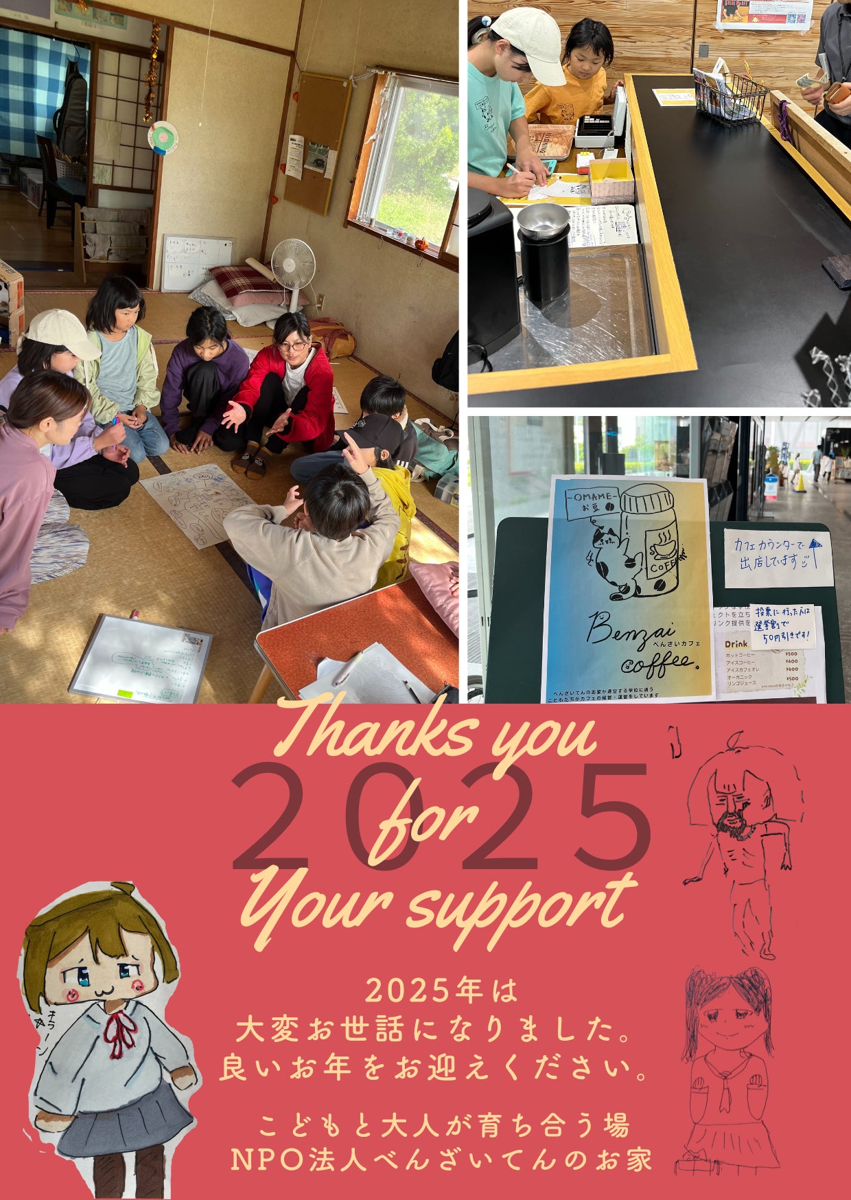2025/12/30 11:13ご支援いただいた皆様へ2025年の年末を迎えられているのは本年春に皆様からご支援いただいたおかげです。先日お知らせいたしました文化祭は30名の老若男女の皆さんが来てくださいました。特に印象深かったのは、近くのデイサービスから参加してくださったおばあちゃんの一言です。「ここにおる子らは幸せやなぁ」こどもにとっても大人にとっても幸せにすごせるきっかけになる場所として2026年も尽力していきます。いつも見守ってくださり本当にありがとうございます。良いお年をお迎えください。こどもと大人が育ち合う場NPO法人べんざいてんのお家代表理事 吉本真菜実 もっと見る