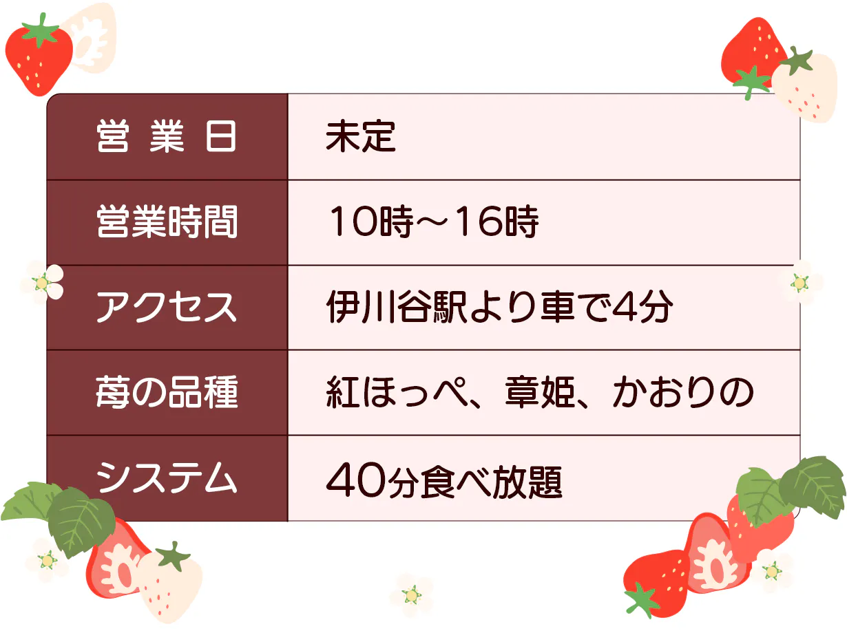 ※いちご狩り体験は、開催日、開催人数が限られています。当園のInstagram、公式LINE、ホームページのいずれかで開催日等をご確認いただき、メッセージにて、お名前、人数、希望の部をご記入の上お申し込み下さい。