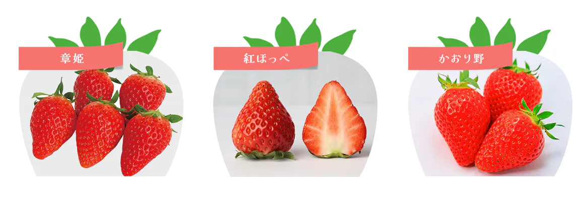 いちごは、甘みがとても強くお子様に大人気の「章姫(あきひめ)」、甘味とともに酸味も楽しめる「紅ほっぺ」、味だけでなく上品な香りも楽しめる「かおり野」の3種類。