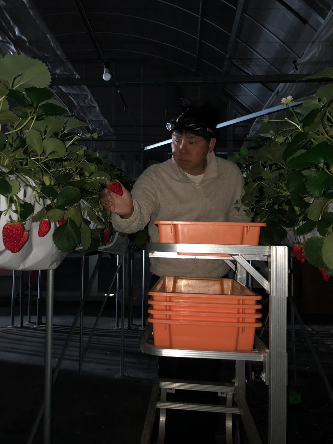 ポテンシャルを最大限に発揮した「ピーク」の味のいちごを生み出すべく、暗い時間に収穫しきります。