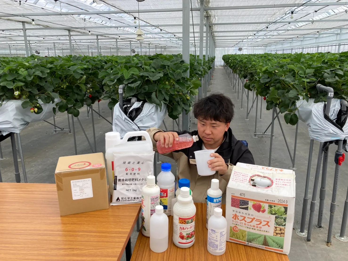 いちごの1シーズンの栽培で、約20種類の肥料を使っています。数種類をブレンドしたり、品種や時期、状況によって使い分けたり。