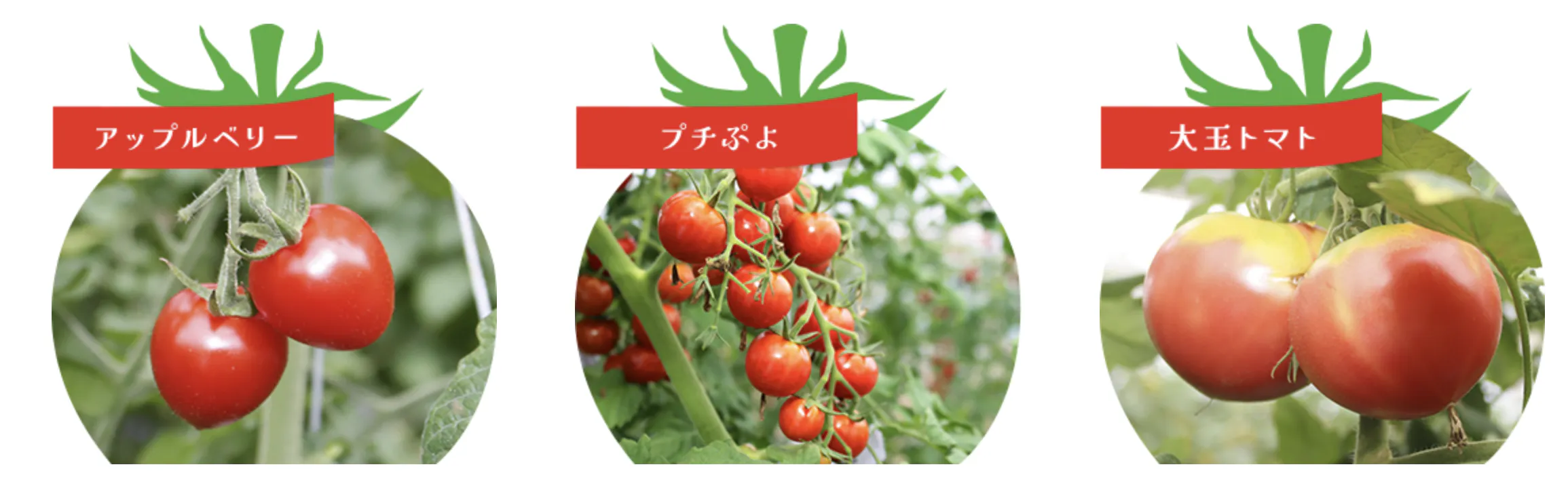 トマトは、糖度が非常に高く「トマトが苦手でも食べられる」と好評の「アップルベリー」、驚くほど皮が薄い「プチぷよ」、段違いの完熟さを誇る「大玉トマト」の3種類。