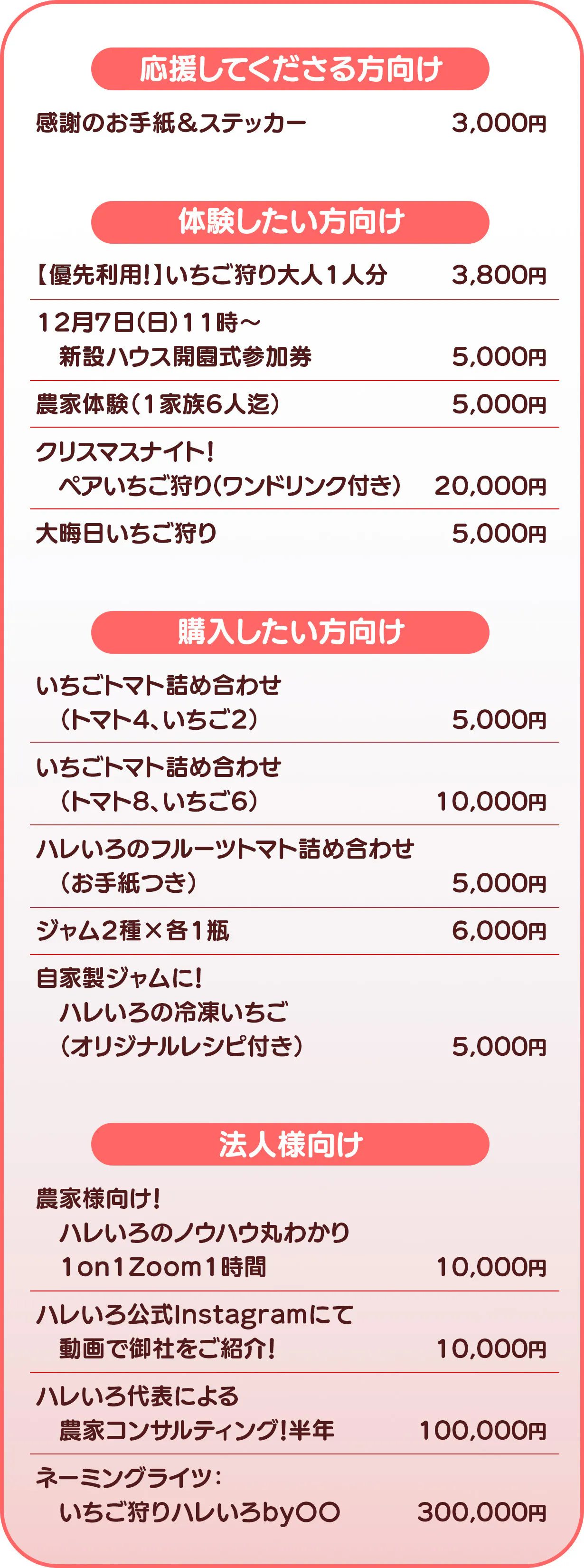ご支援頂いた金額は全額、農園の規模拡大にかかる諸費用(いちご狩り専用ハウス建設費用/その他付帯設備等)に充てさせて頂きます。