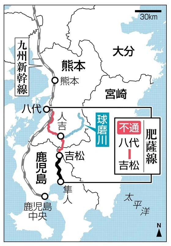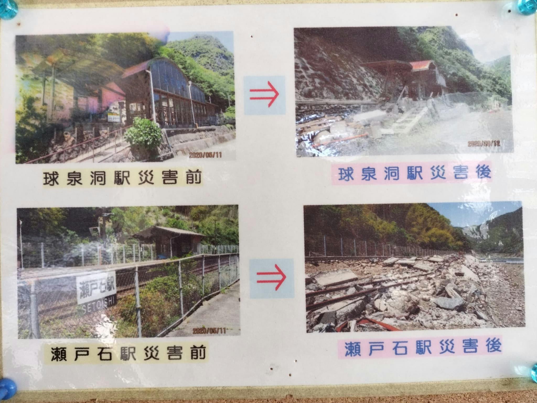 ・線路の流出・埋没:人吉市~坂本町の間で複数の箇所で線路が流出 駅舎の損壊:一部駅舎が浸水や破損 ・土砂崩れの発生:線路沿いの山間部で土砂崩れが発生し、復旧の妨げに 運行状況(2025年現在)