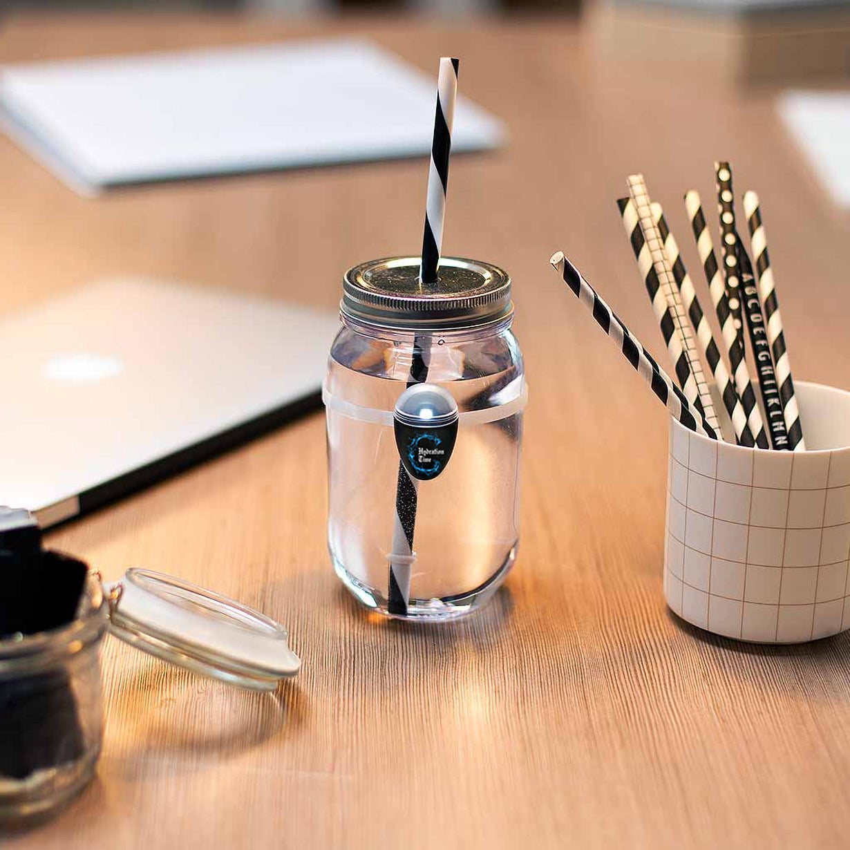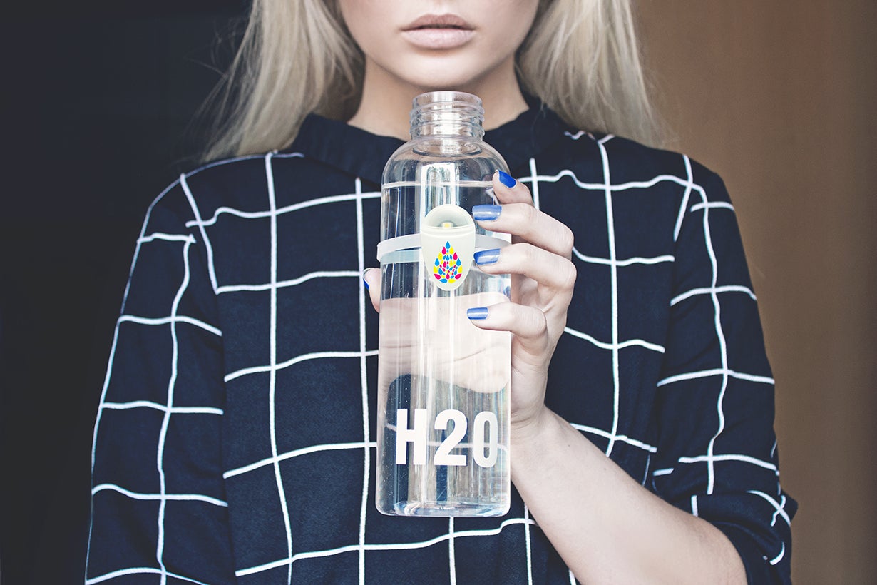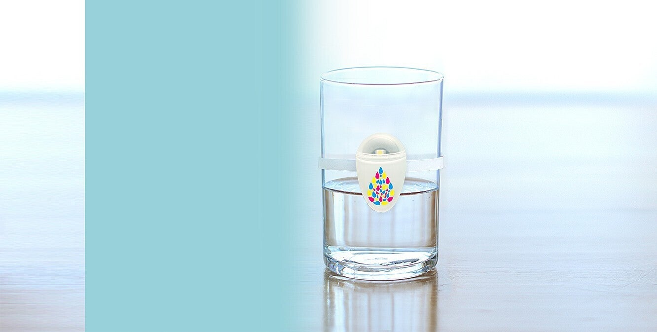 水を意識的に摂れるよう、お知らせしてくれるアイテムです。水の入ったコップやボトルに、バンドで装着したら準備完了!