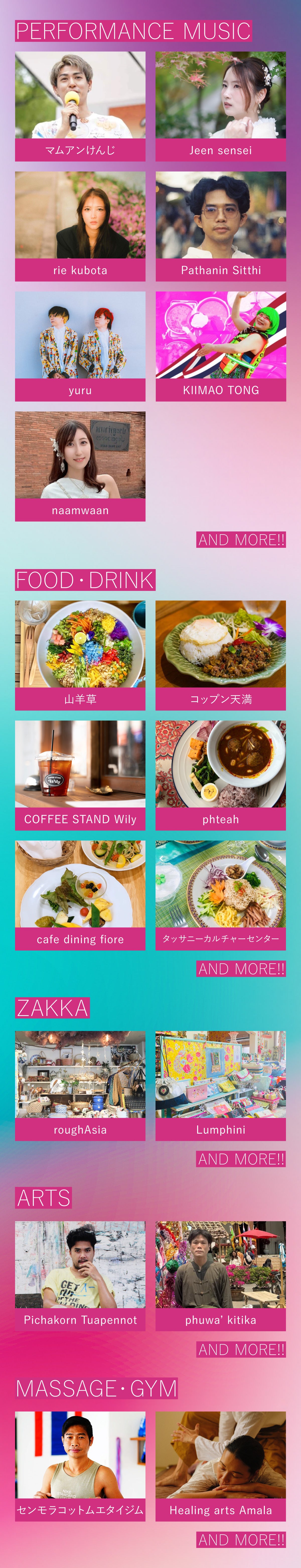 タイの本場の味を届ける料理人たちがつくるタイ料理、タイのアートやマッサージなど、宝塚タイフェスならではの個性溢れるお店が勢揃いしてます!また、今回は地域のお店の参加や市民のボランティアも増え、宝塚の魅力もお伝えできる地域とも密着したイベントともなるようスタッフ一同企画を進めております。