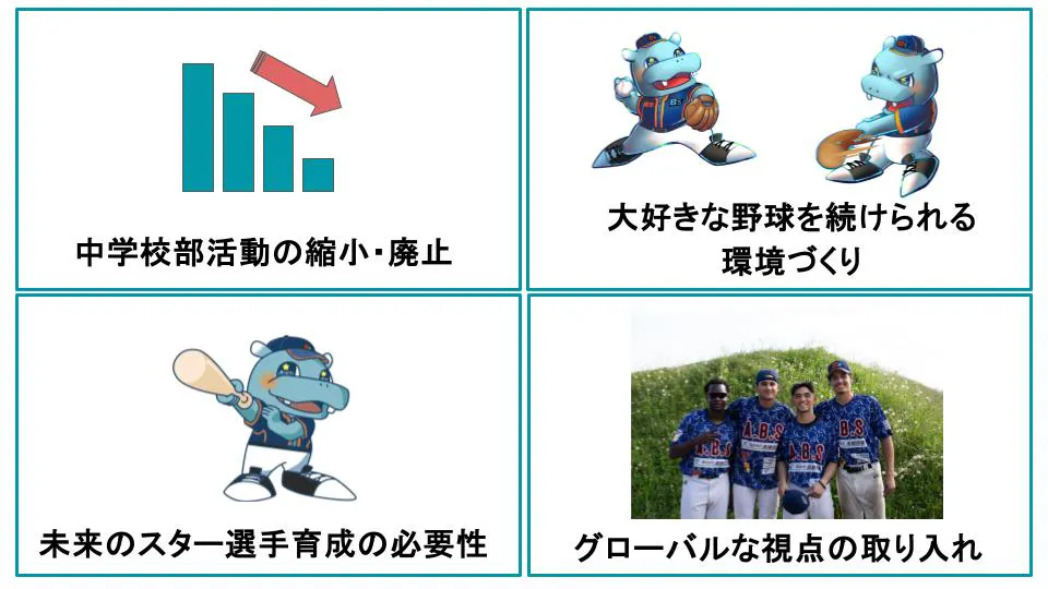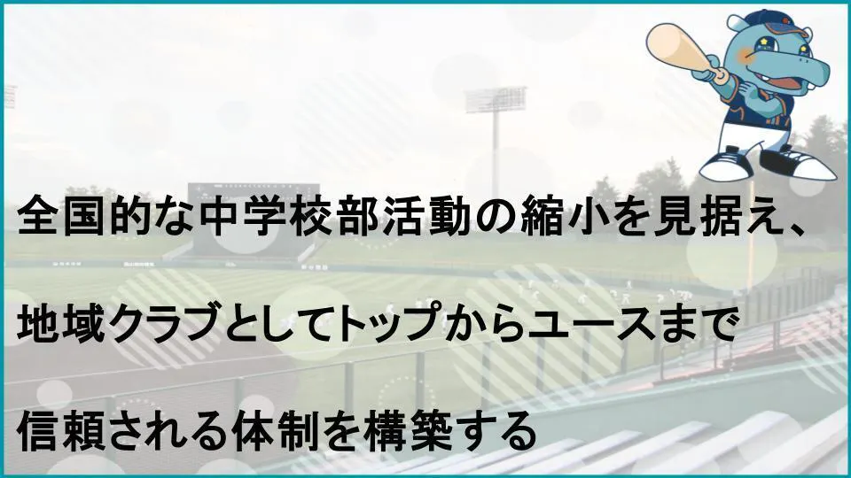 将来的に全国的な中学校の部活動縮小が見込まれる中、子どもたちが日常的に野球やスポーツに親しむための基盤が求められています。