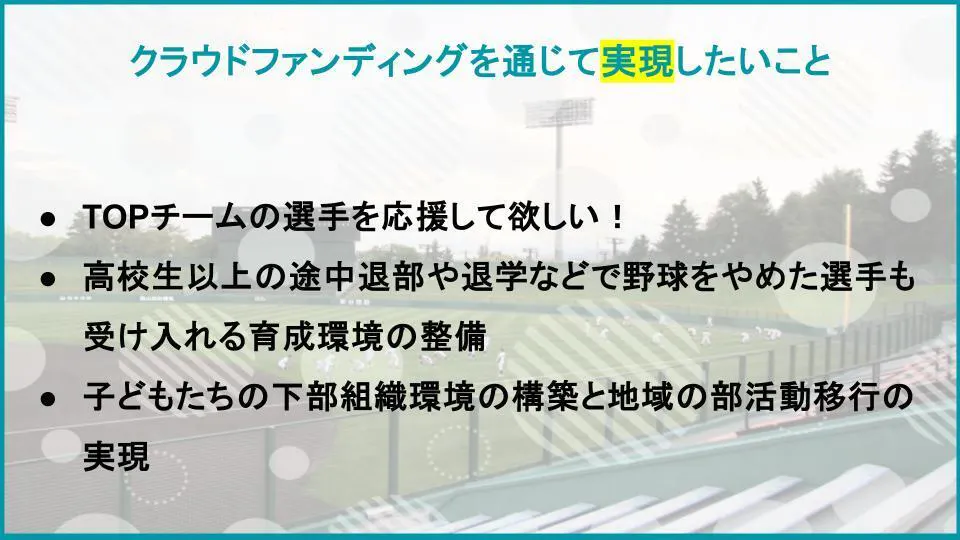 本プロジェクトは、野球を通して地域全体に希望と活力をもたらすことを目指しております。