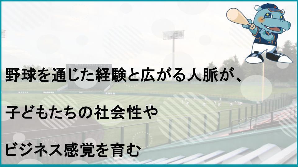 野球を通じた経験と広がる人脈が、子どもたちの社会性やビジネス感覚を養うメンタリティの形成にも寄与することを期待しています。