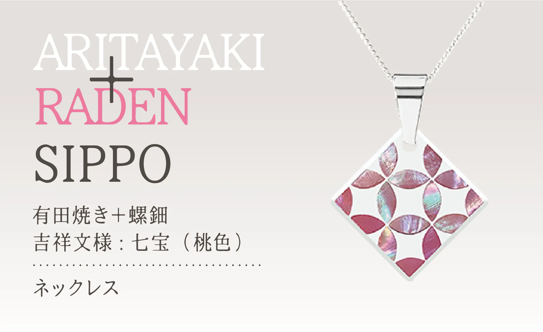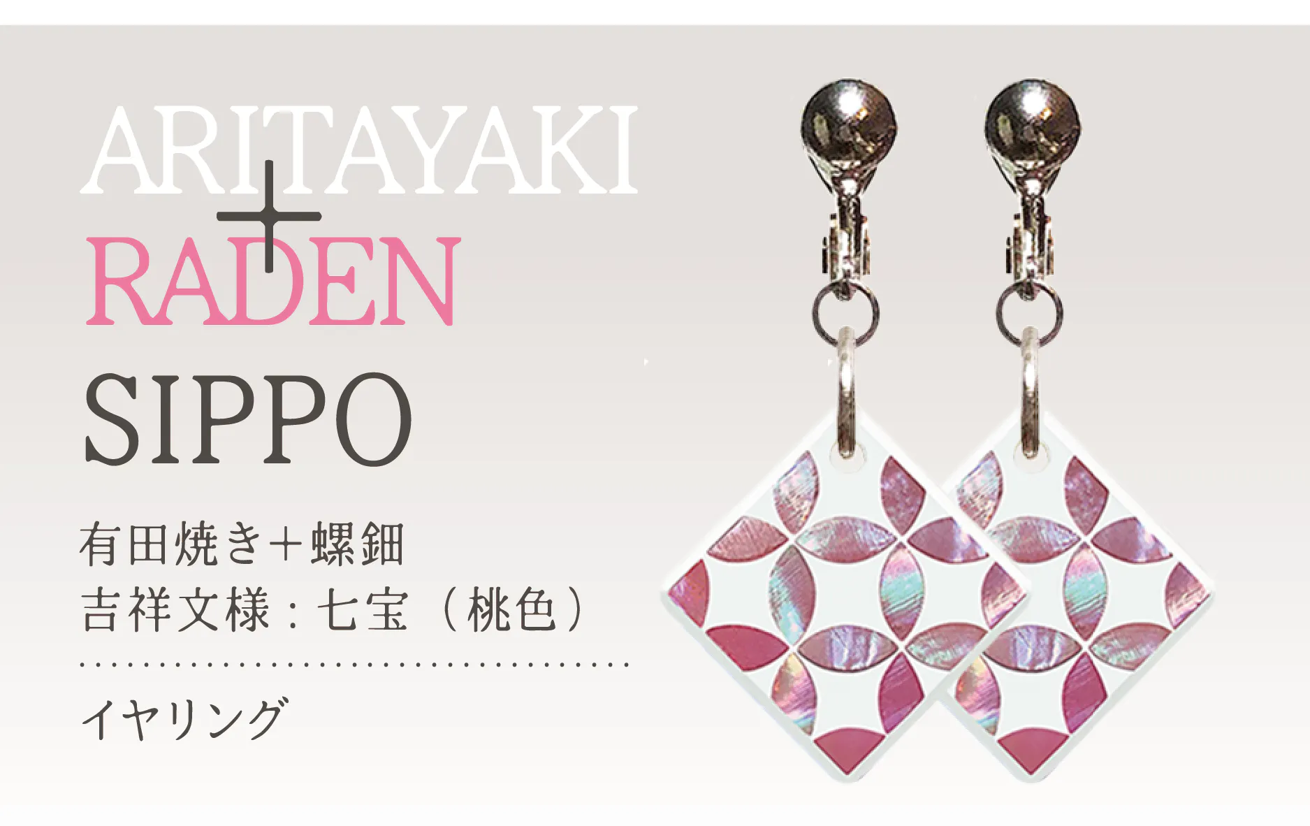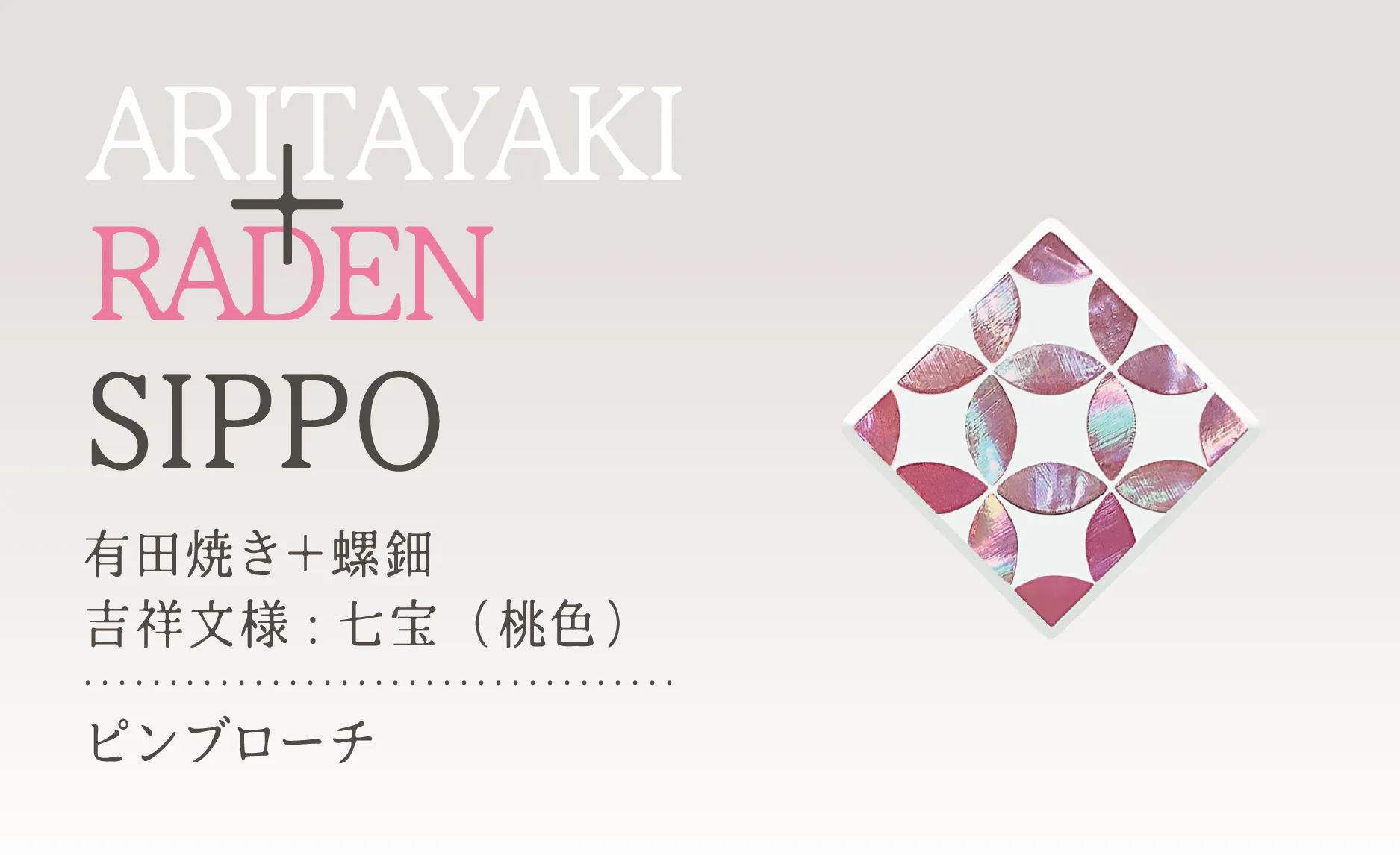 佐賀県の“有田焼”と輪島の蒔絵師による“螺鈿”のコラボレーションの製品をお返しの品とさせていただきます。このコラボレーションは、これまであまり前例がないようです。2種類の吉祥文様のデザインをベースにピンブローチ・ネックレス・ピアス・イヤリングをそれぞれご用意しております。