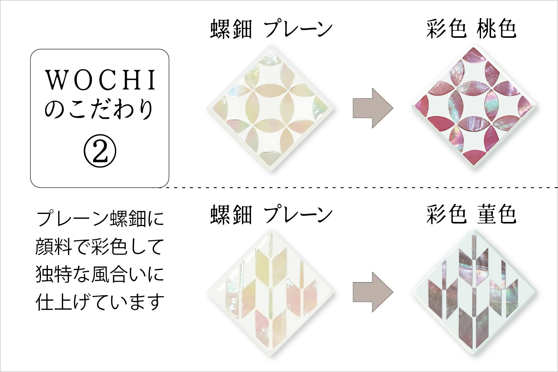 「存続の危機にある伝統工芸の一助となりたい。」 日本美術は、19 世紀末から20 世紀初頭にかけてヨーロッパで「ジャポニスム」として流行し、著名な画家や芸術家、ルイ・ヴィトンにも影響を与えたとされました。その日本美術の伝統工芸が今、色々な要因で存亡の危機にあります。『WOCHI(をち)』は、伝統工芸の再興を願い活動を開始しました。日本ならではの卓越した技や名工が生み出す伝統工芸品の美しさを現代のライフスタイルに合ったモダンな吉祥文様のラッキーアクセサリーとして新しく仕立て直し、日本はもとより世界中にその素晴らしさを知ってもらいたいと願う『WOCHI』は、「もとに戻る」「若返る」と言う意味を持つ日本の古語【復ち/ をち】をブランド名としました。