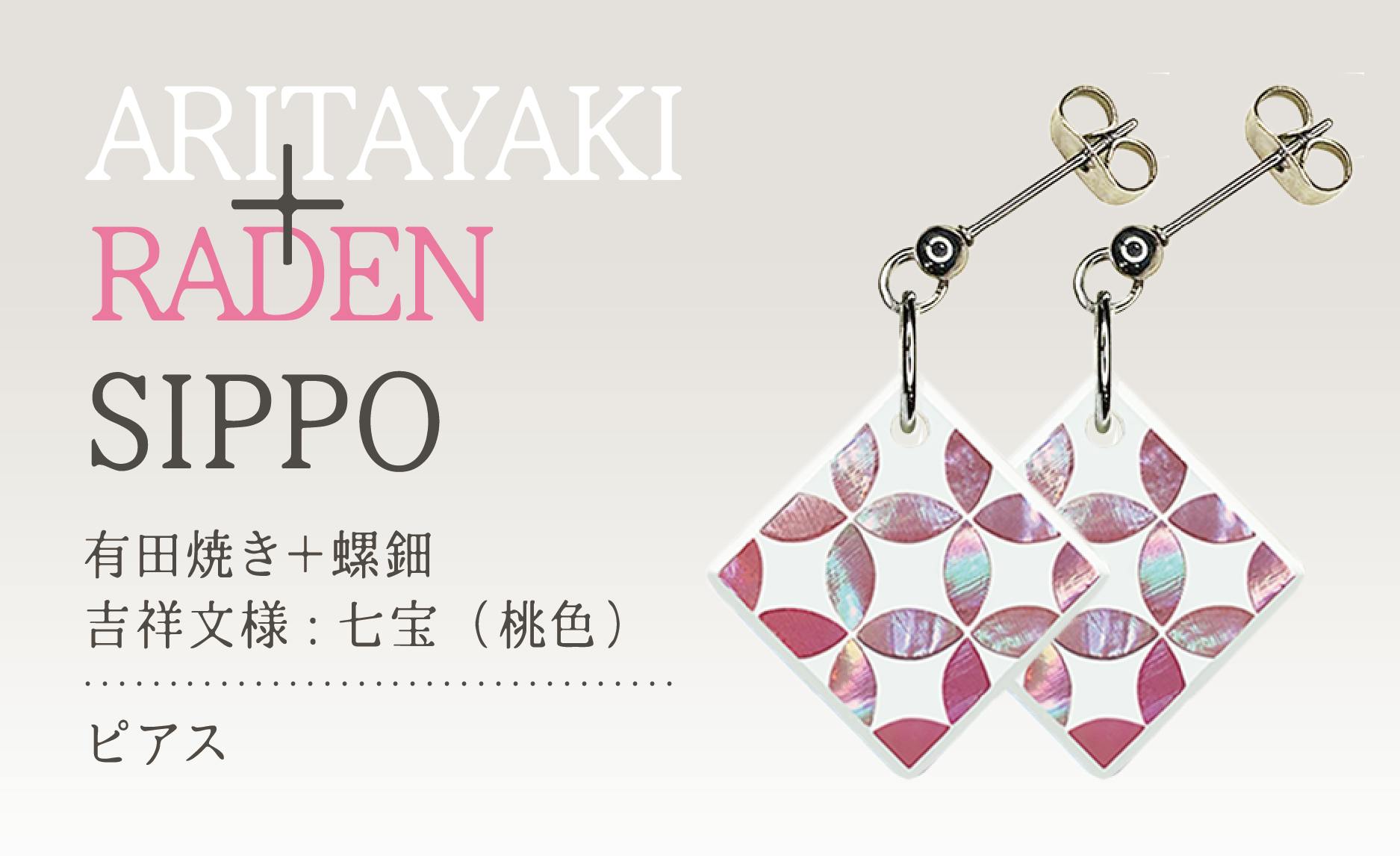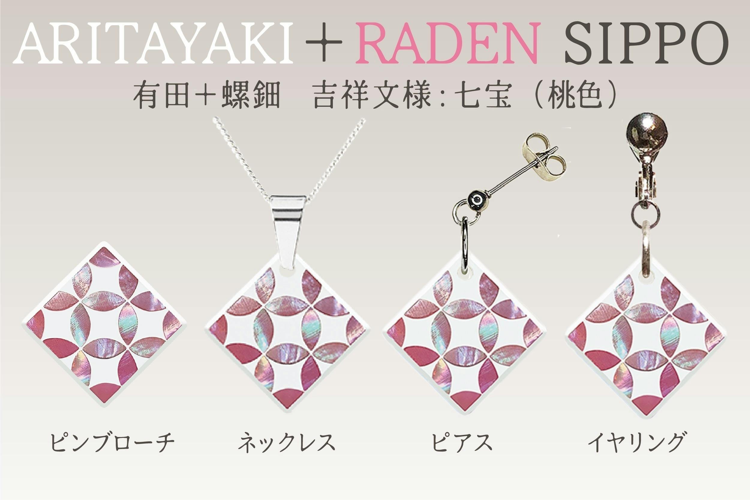 今回、佐賀県の“有田焼”と輪島の蒔絵師による“螺鈿”のコラボレーションの製品をお返しの品とさせていただきます。このコラボレーションは、これまであまり前例がないようです。2種類のデザインをベースにピンブローチ・ネックレス・ピアス・イヤリングをそれぞれご用意しております。