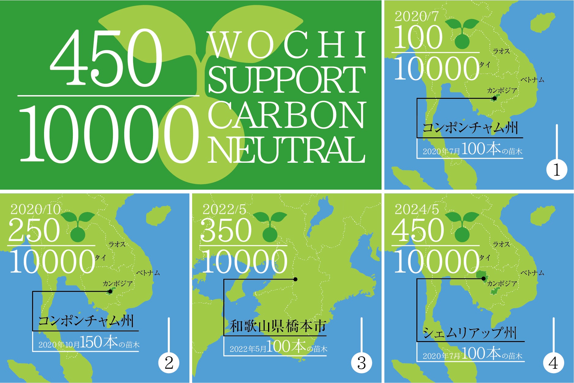 WOCHIは、これまで植林や植林のための苗木代の寄付など4回の活動を行なってまいりました。1回目(2020/7)は、カンボジア・コンポンチャム州へ苗木代100 本分を寄付。2回目(2020/10)は、カンボジア・コンポンチャム州へ苗木代150 本分を寄付。カンボジアの苗木は成長が早く、CO2をストックして大きく成長した時に伐採して家具や建材となります。また、伐採された樹の代金は、現地の方の収入になります。3回目(2022/5)は、和歌山県橋本市に和紙の原料となる楮(こうぞ)の苗木100 本を植林しました。楮も成長が早く、2年ほどで原料となります。4回目(2024/5)は、アンコールワットのあるカンボジア・シェムリアップ州へ苗木代100 本分を寄付。今年は、ラオスの農家さんの収入増につながる果樹の苗木代の寄付を予定しています。