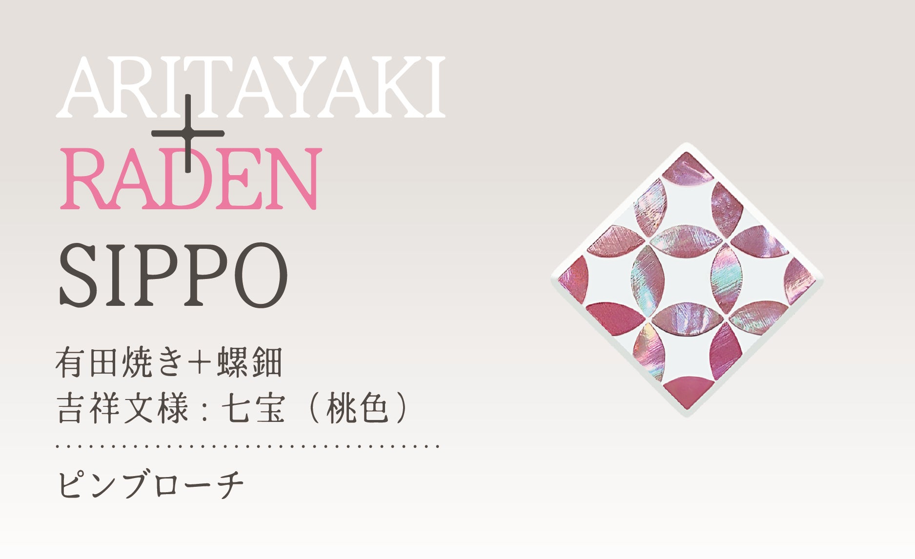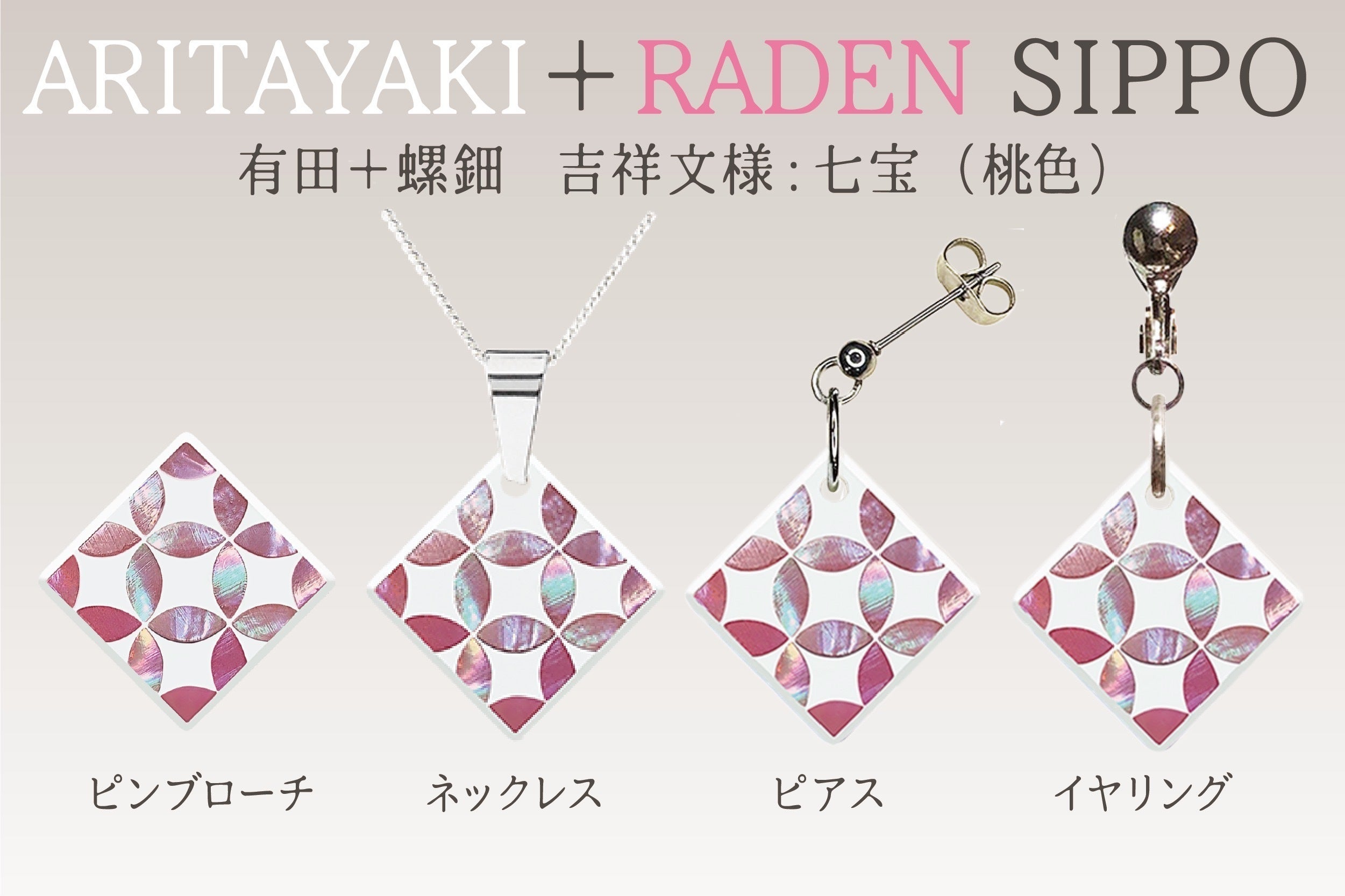 佐賀県の“有田焼”と輪島の蒔絵師による“螺鈿”のコラボレーションの製品をお返しの品とさせていただきます。このコラボレーションは、これまであまり前例がないようです。2種類の吉祥文様のデザインをベースにピンブローチ・ネックレス・ピアス・イヤリングをそれぞれご用意しております。