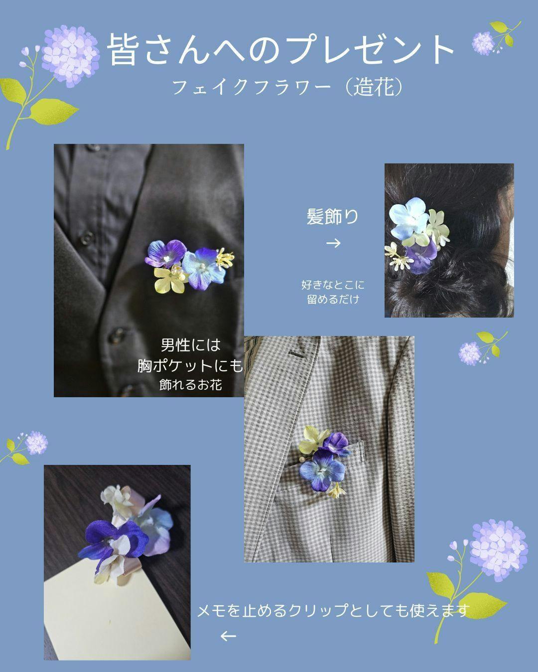 2025/05/22 12:00みなさん、こんにちは!第3回FLOWER&Barを開催するにあたり、今回は小物をプレゼントします。いつもは席札とともにお花を置いてましたが、それをお持ち帰りいただいても利用できるようにしました。小さめのヘアークリップで作ってあるので、画像のように女性は髪飾りとして、男性はスーツの胸ポケットのアクセントとして、また、ちょっとメモを留めるに使えます。ぜひとも、当日お持ちかえりくださいね。あと・・・お願いです!!当日お越しいただく方、ぜひ、お名前をお教えください。クラウドファンディング上では、メールアドレス等のみになり、ご来店確認ができにくいので、お手数ですが、備考欄に代表者のお名前を記載していただけると助かります。よろしくお願いします!みなさんのお越しをおまちしてます~! もっと見る