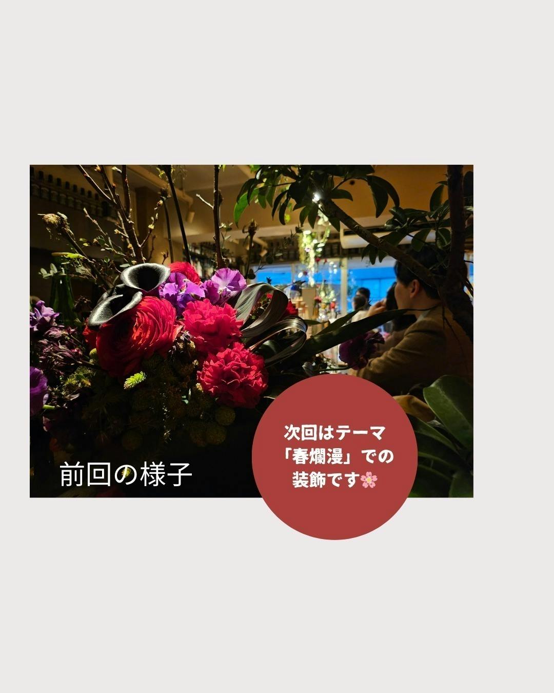 今回はテーマ「春爛漫」として、ゴールデンウイークの始まりに相応しく春の華やかな楽しい空間を作り上げます。前回あまり写真を撮っていただけるスペースがなかったので、今回はフォトスポットを作ろうかと考えてます。お花と一緒に記念撮影してくださいね。