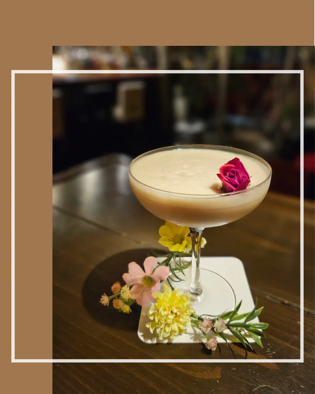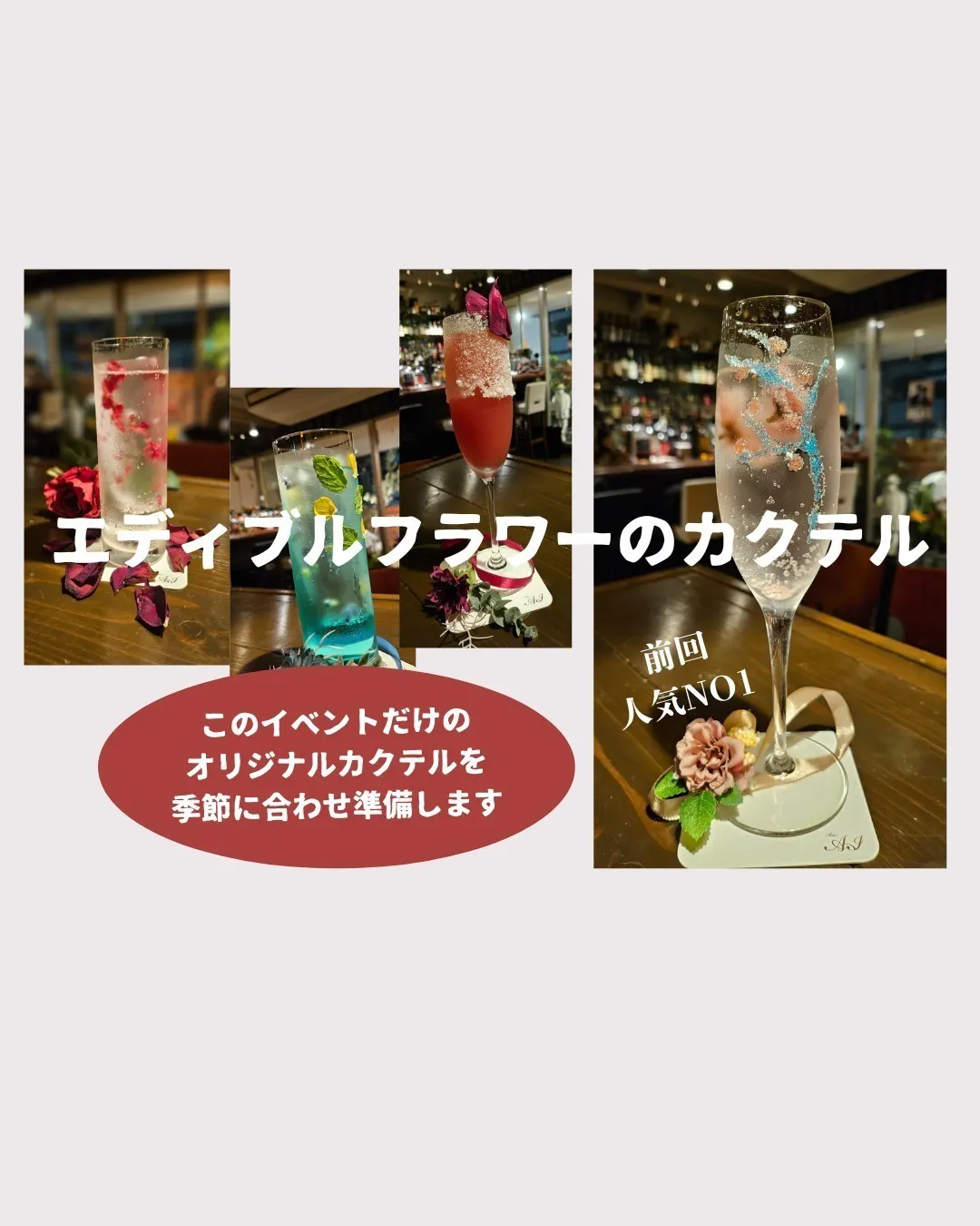 お花は季節のお花(生花や造花等)で店内を装飾し、カクテルは季節のお花をイメージさせるエディブルフラワーカクテルをオリジナルで作成。