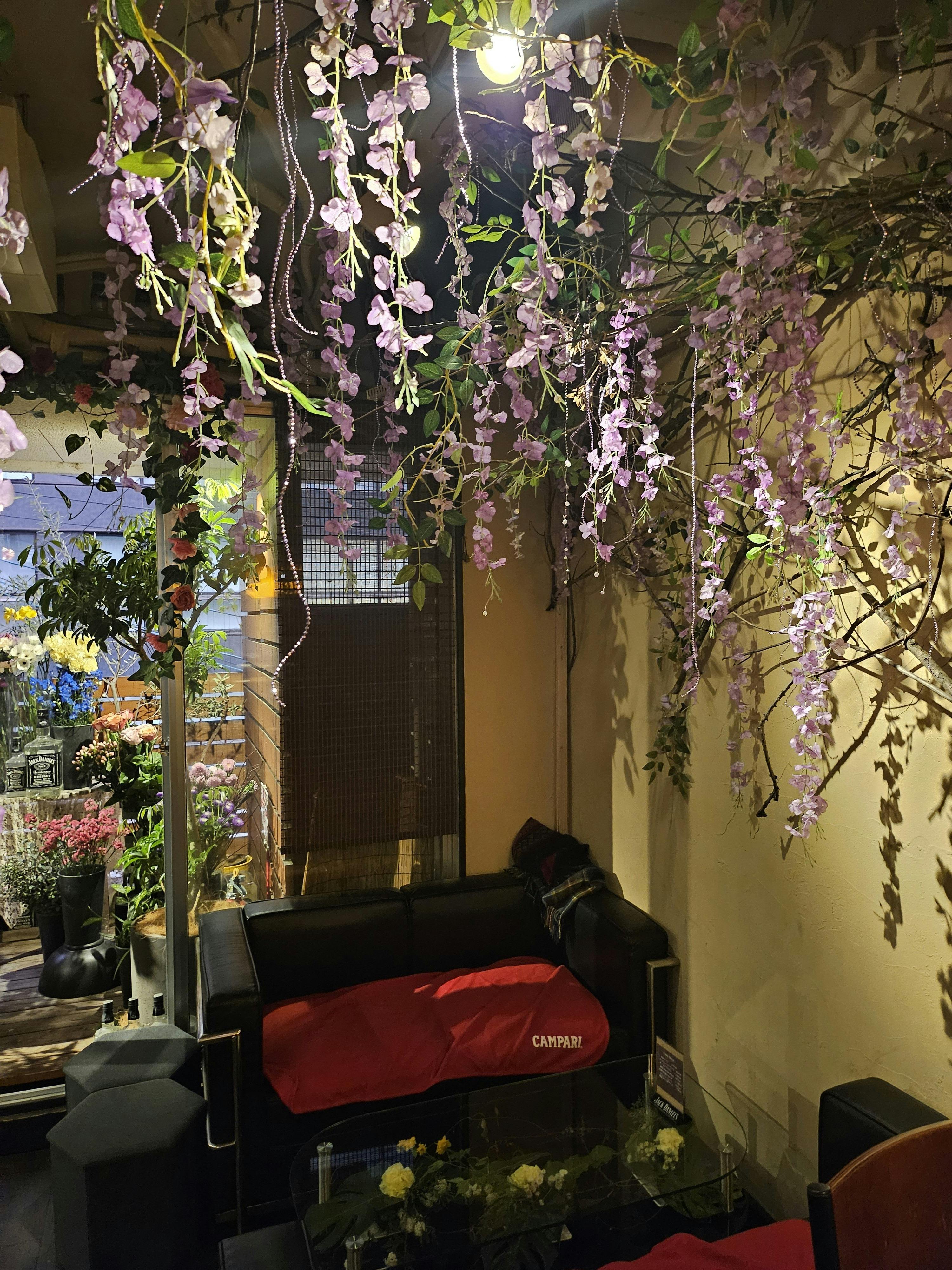 店内は桜のアーチをくぐって入っていただき、八重桜のあとは、藤棚を作りました。
