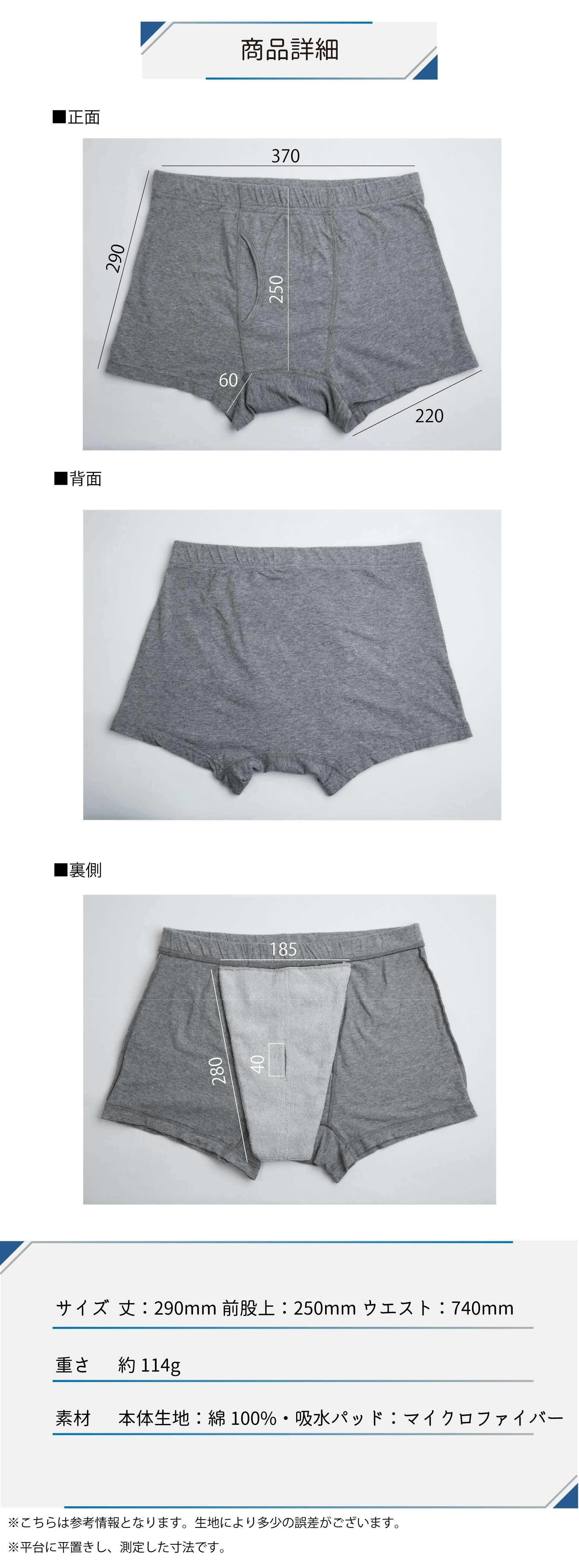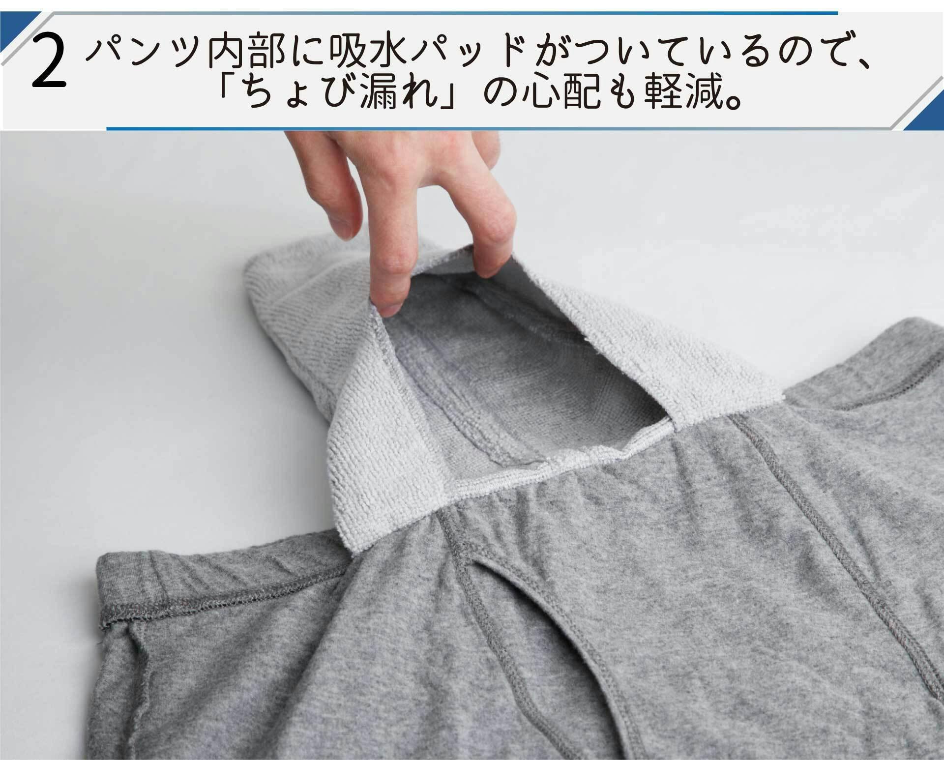 男性の多くが加齢とともに経験する「ちょび漏れ」。わずかな尿漏れでも、肌に触れることで不快感につながったり、衣類への染み出しを心配する方も少なくありません。特に陰嚢まわりに尿が触れると、蒸れや摩擦と相まって肌環境を乱す原因になることも。このパンツは、そうした日常の小さな不安をやわらげるため、パンツ内部に吸水パッドを内蔵。見た目はごく普通のパンツでありながら、薄型のパッドが“ちょび漏れ”をしっかりキャッチし、下着の内側や肌への広がりを抑える構造です。吸水性・防水性・通気性に配慮した設計で、日々の快適さと安心感をサポートします。