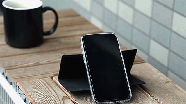 ビジネスシーンに最適。手帳ケースを台座代わりにすれば、余計な背景が映り込むことなく、スマホカメラで名刺を瞬時にスキャンできます。手帳ケースとスマホの着脱が自在だからこそできる、スムーズな名刺撮影です。名刺の管理が煩雑になりがちな展示会などで、とっても重宝する使い方になります。