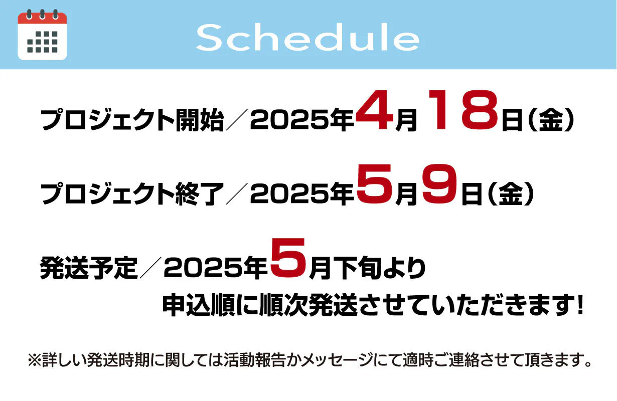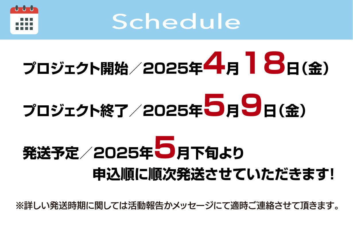 ・本文中に記載させていただいたスケジュールは、あくまでプロジェクト公開時点の予定です。 ご支援の性質上、配送遅延のおそれがございます。