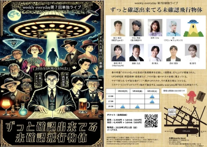 『weekly everyday』は、これからも笑いと感動をたくさんの人に届けるため、あなたの応援を力にして舞台を作り上げていきます。UFOや預言者、降霊術といった非日常的な世界を共に体験し、笑いと驚きで心を満たしましょう。