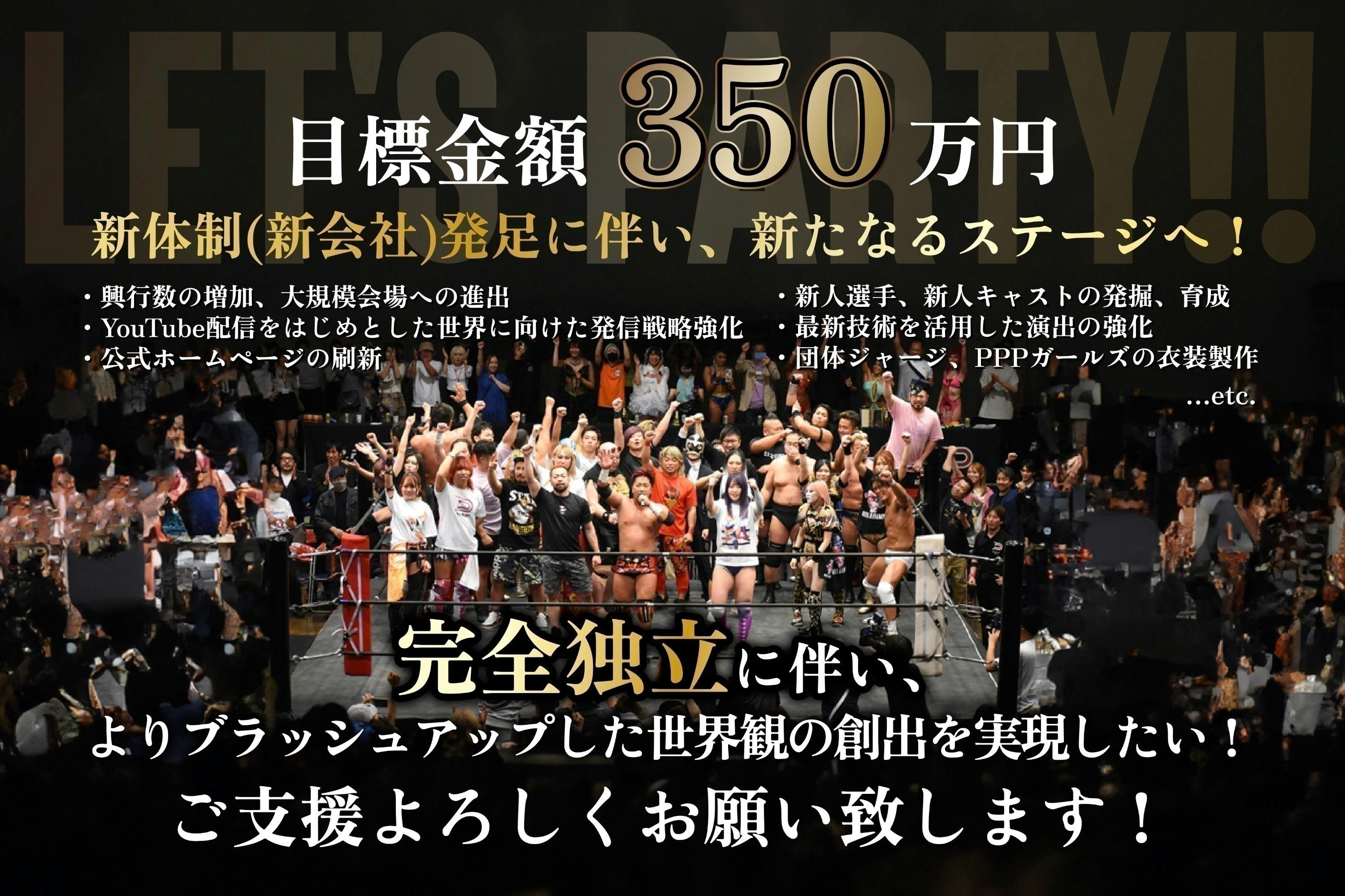 新進気鋭のプロレス団体「PPPTOKYO」旗揚げ5周年を迎え、プロレスラー・スタッフ・ファンが充実しつつある中、独特な世界観を次なる1歩を推し進めるために必要な資金を、ファンの皆様の応援と共に募らせていただく事となりました。