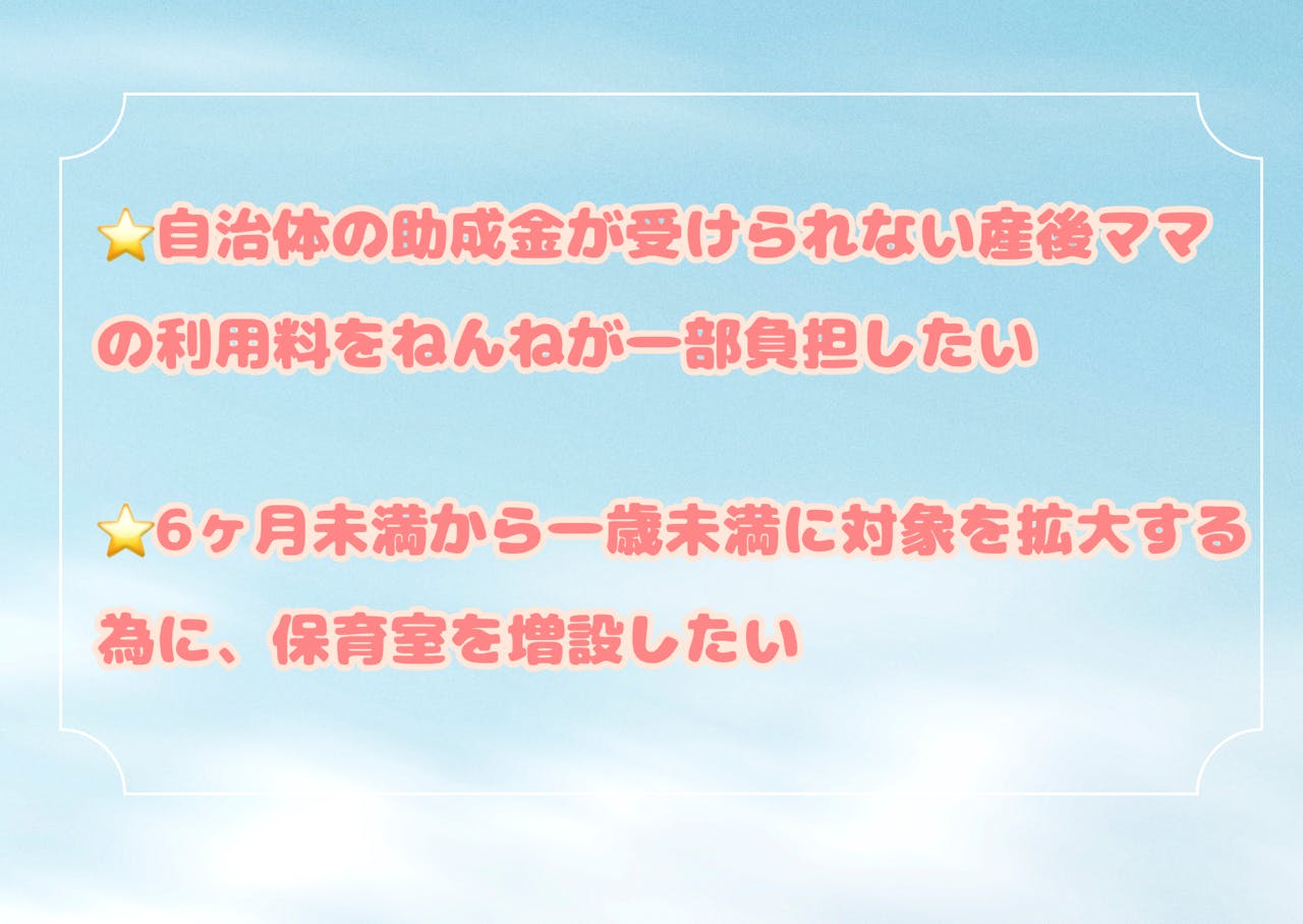 現在6カ月未満の赤ちゃんを対象としていますが1歳未満に対象を拡大し、産後ママと赤ちゃんにとって安全で安心できる保育室を増設したいと考えています。
