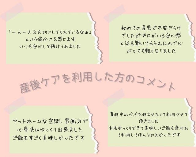 また、産後ママが利用することで、育児をサポートしているパパやおばあちゃんにも休息してもらいたいと思っています。