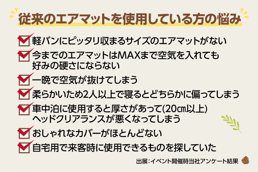 従来のキャンピングカーは価格が高く、大きすぎて日常使いしにくいという課題がありました。軽バンをベースにしたキャンピングカーはコンパクトで実用的、かつ価格を抑えたモデルとして設計されたことで需要が高まっています。また、コロナ禍以降アウトドアブームが加速し「密を避けて自由に旅を楽しみたい」というニーズやソロキャンプ・車中泊ブームの影響もあり、軽バンにも入る高性能なエアマットを求める声が多くなりました。