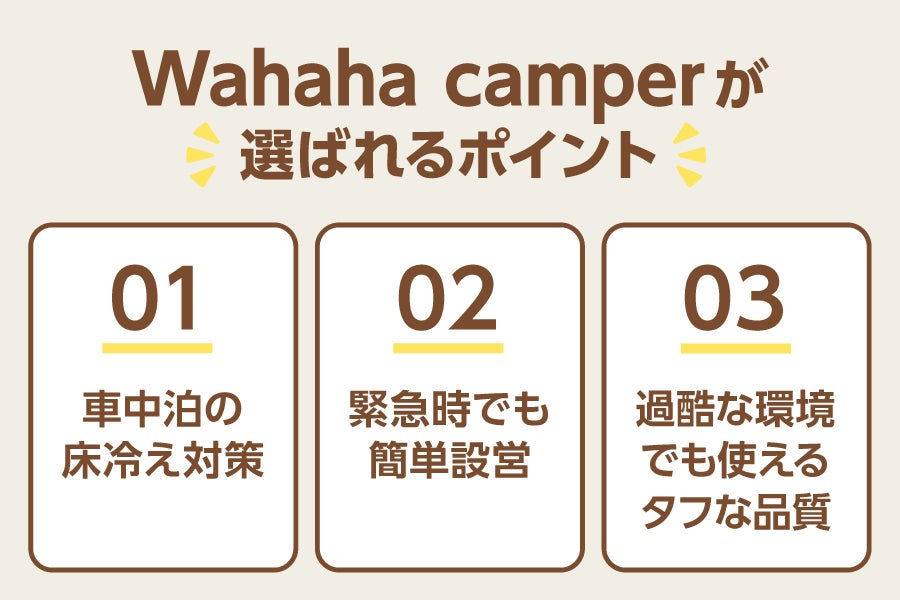 「車中泊って難しそう」「ちゃんと眠れるか心配」——そんな不安をすべて取り払い、誰でも気軽に自然とふれあい、心の底から「ワハハ!」と笑えるひとときを。