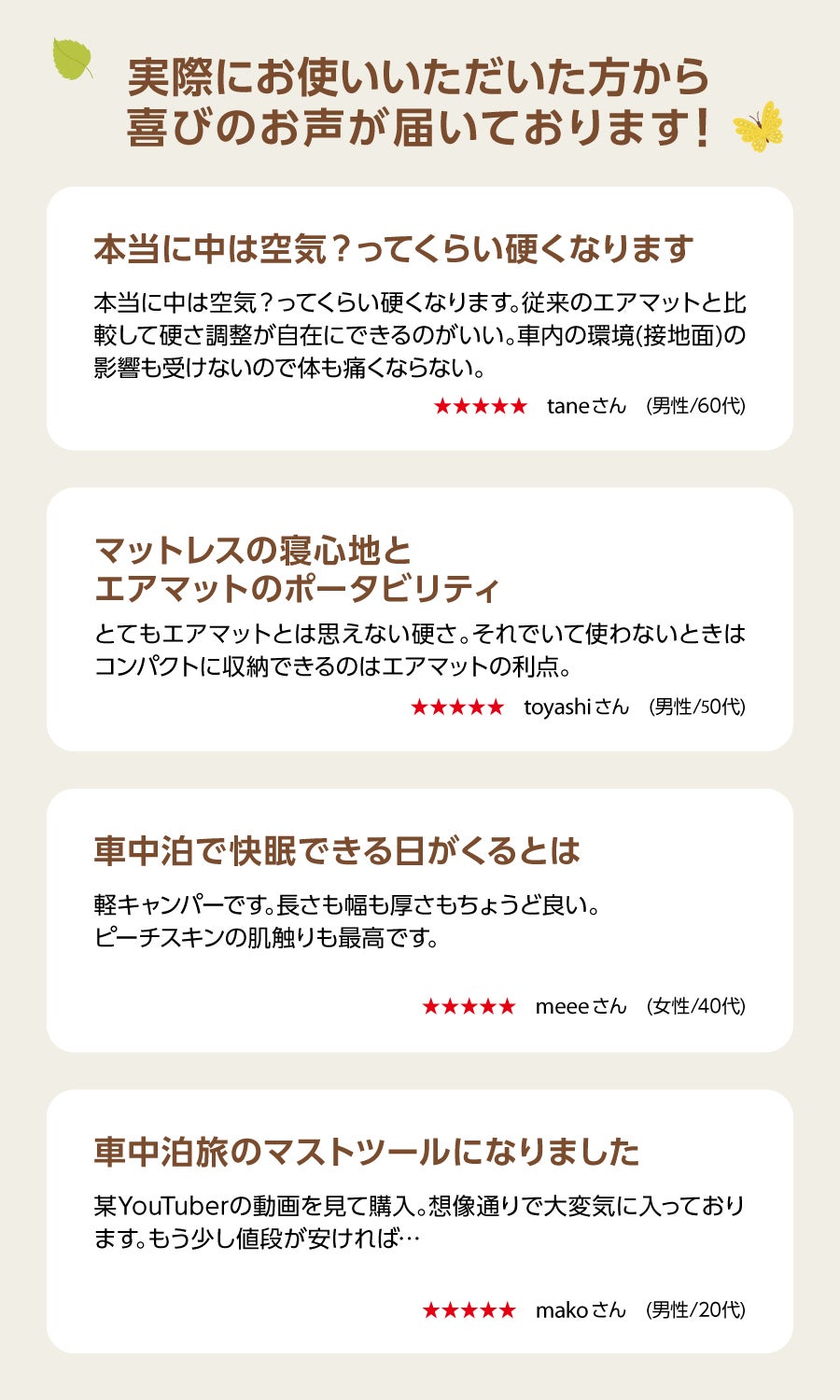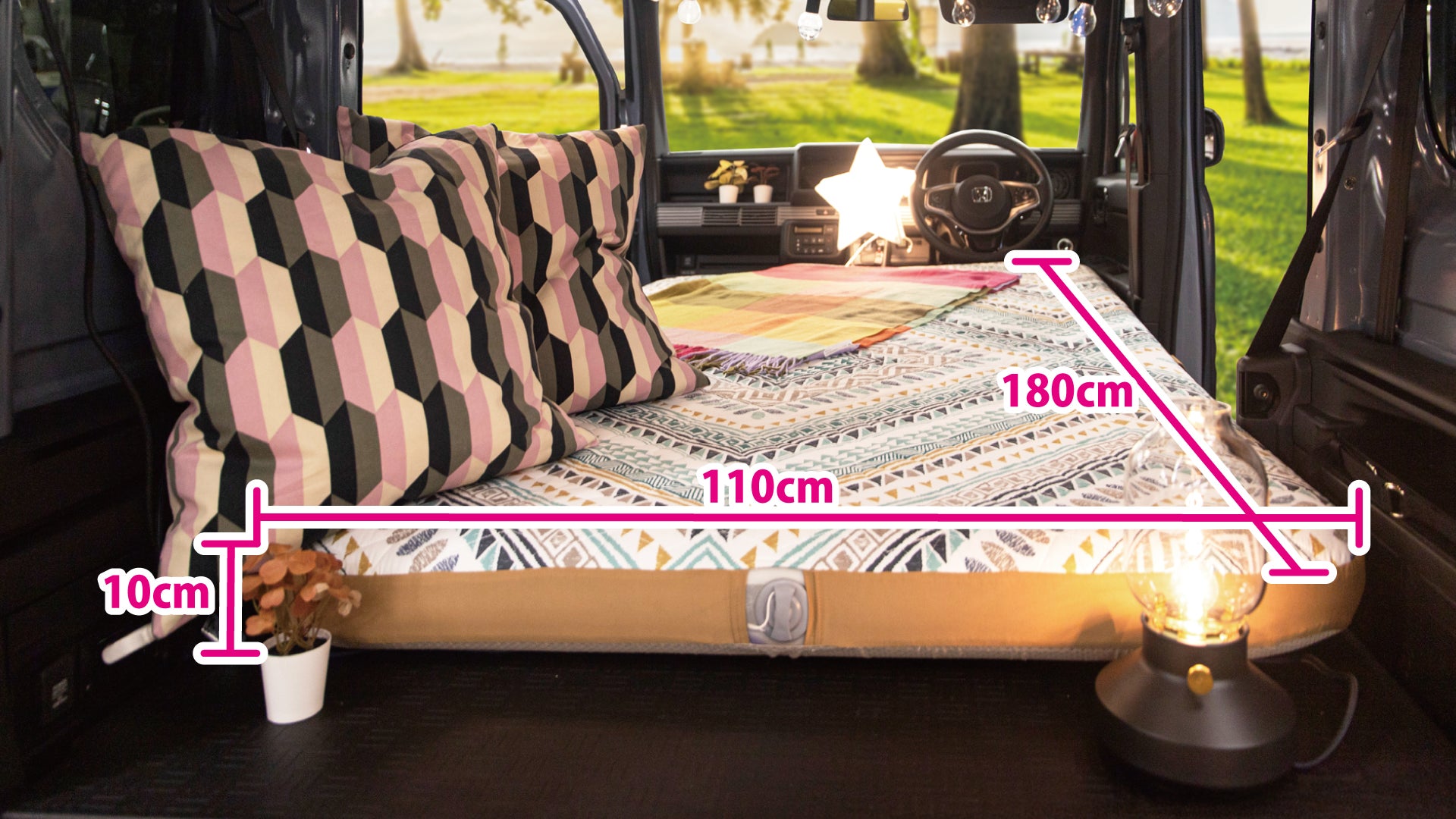 新技術を使った常識を覆すエアマット。長さも180㎝なので軽バンにピッタリ入るジャストフィット設計で、これからの軽キャンパーのマストアイテムに。
