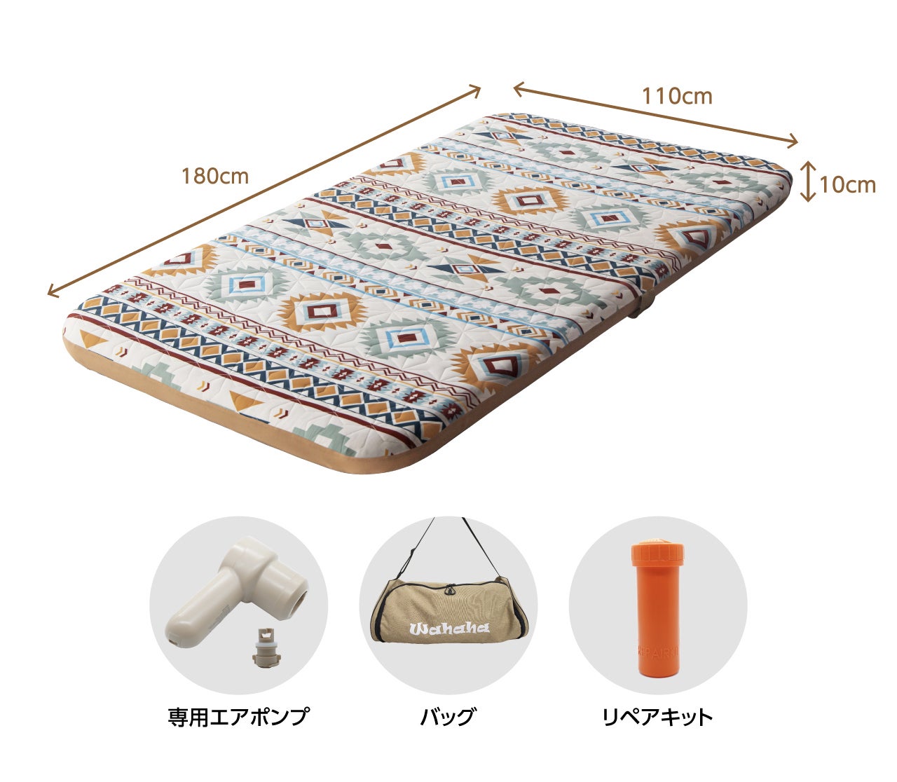 今までのエアマットは長さ200㎝がほとんどで軽自動車には前の座席を倒しても入らないことがほとんどでした。Wahaha camper(ワハハキャンパー)のサイズは軽バンにも入る長さの180㎝、今までエアマットでの車中泊を諦めていた軽キャンパーのための救世主アイテムです!また、幅も110㎝でシングルサイズより広く、隙間なくピッタリと収まります。おひとりはもちろん、大人2人+小さなお子様1人でも寝られるサイズ!厚さも10㎝でヘッドクリアランスが悪くならない絶妙な設計です!