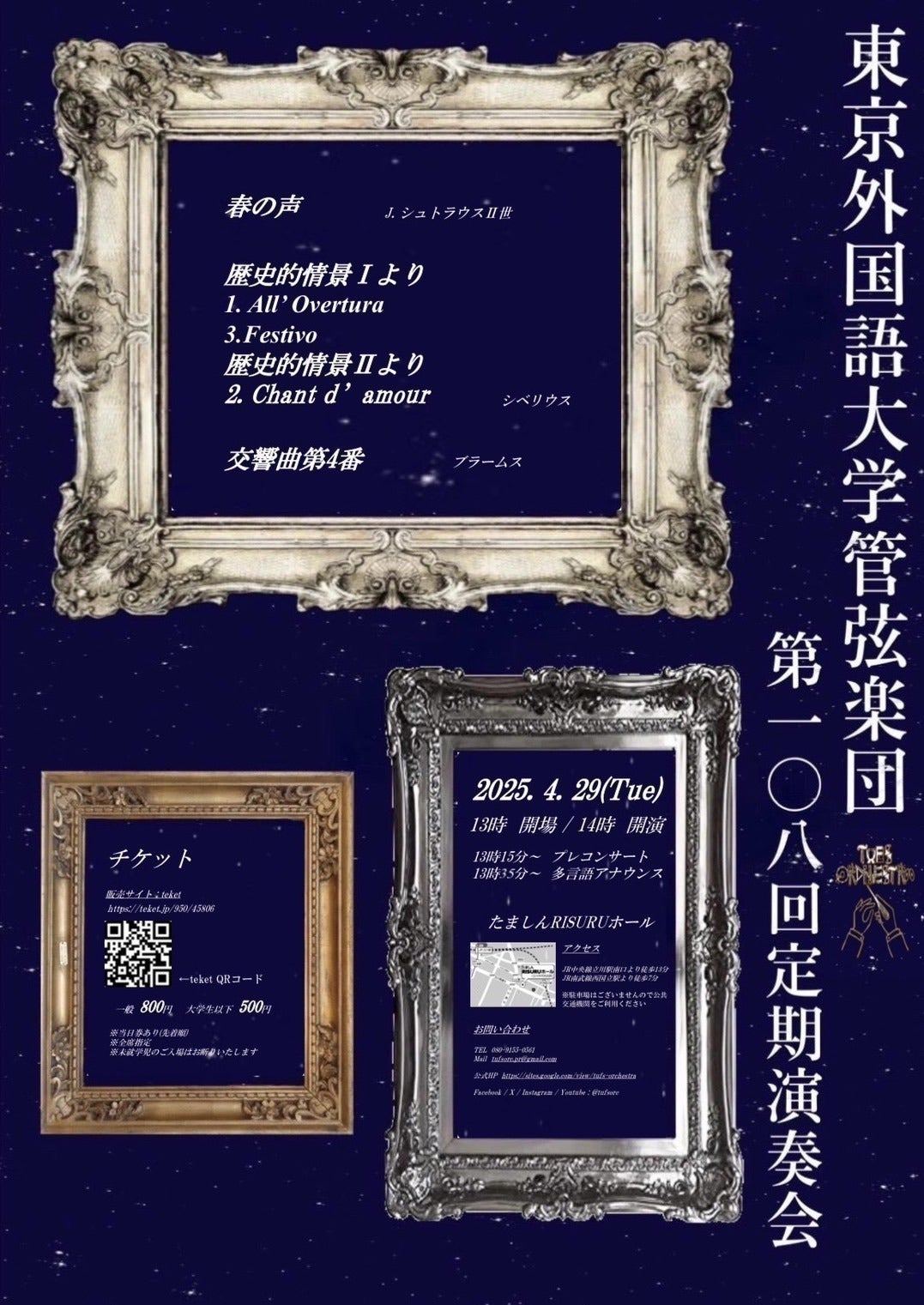 東京外国語大学管弦楽団 第108回定期演奏会を開催します。今回は前回の演奏会後に留学に行った先輩方が抜けての初めての定期演奏会です。なかなかハードな楽曲もあり、人数が少ないなりに試行錯誤しながら力を入れて日々練習に励んでいます。外大オケならではの各々の専攻語や留学生による母国語での多言語アナウンスにもご注目ください!また、開演前のアンサンブルもお楽しみください!