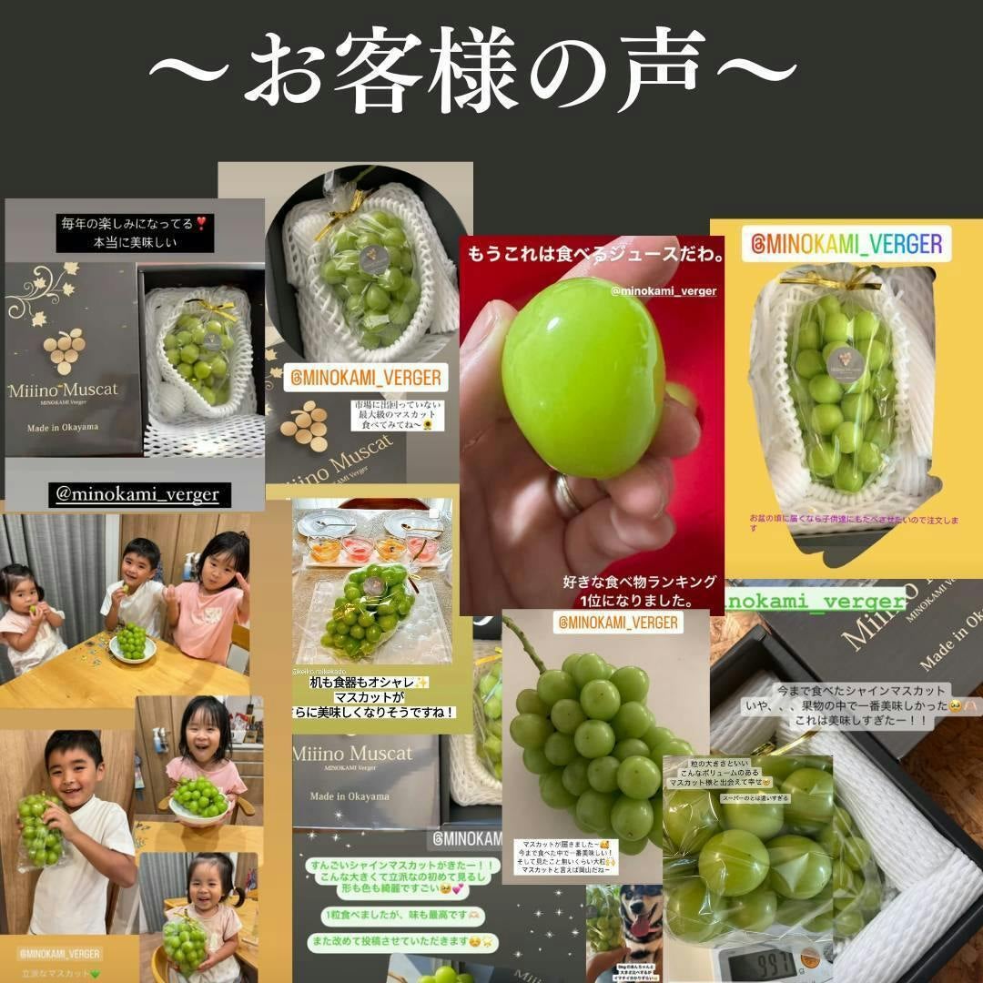 今年も楽しみにしてて、届いたらあっという間になくなってしまった、、、泣。百貨店に並んでるシャインマスカットを見るけど値段に釣り合わないなぁってMINOKAMI Vergerさんのところと比べています。味の違いは分かりませんが(笑)でも絶対どこのシャインマスカットには負けないわ!と思っています。MINOKAMI Vergerの大ファンです!!来年もよろしくお願いします!