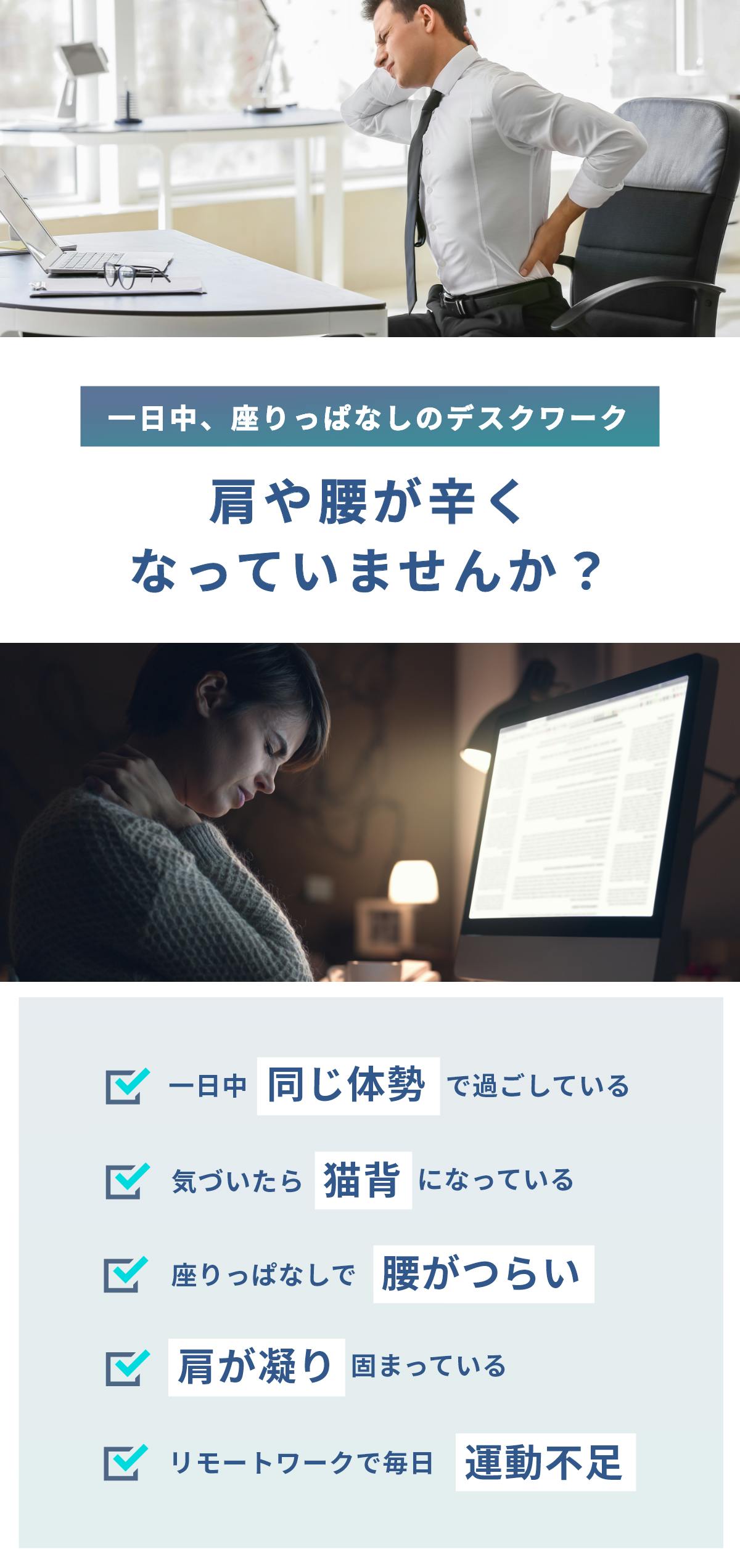 デスクワークで1日座りっぱなし、ずっと座っているのがツライ、あなたにオススメです。