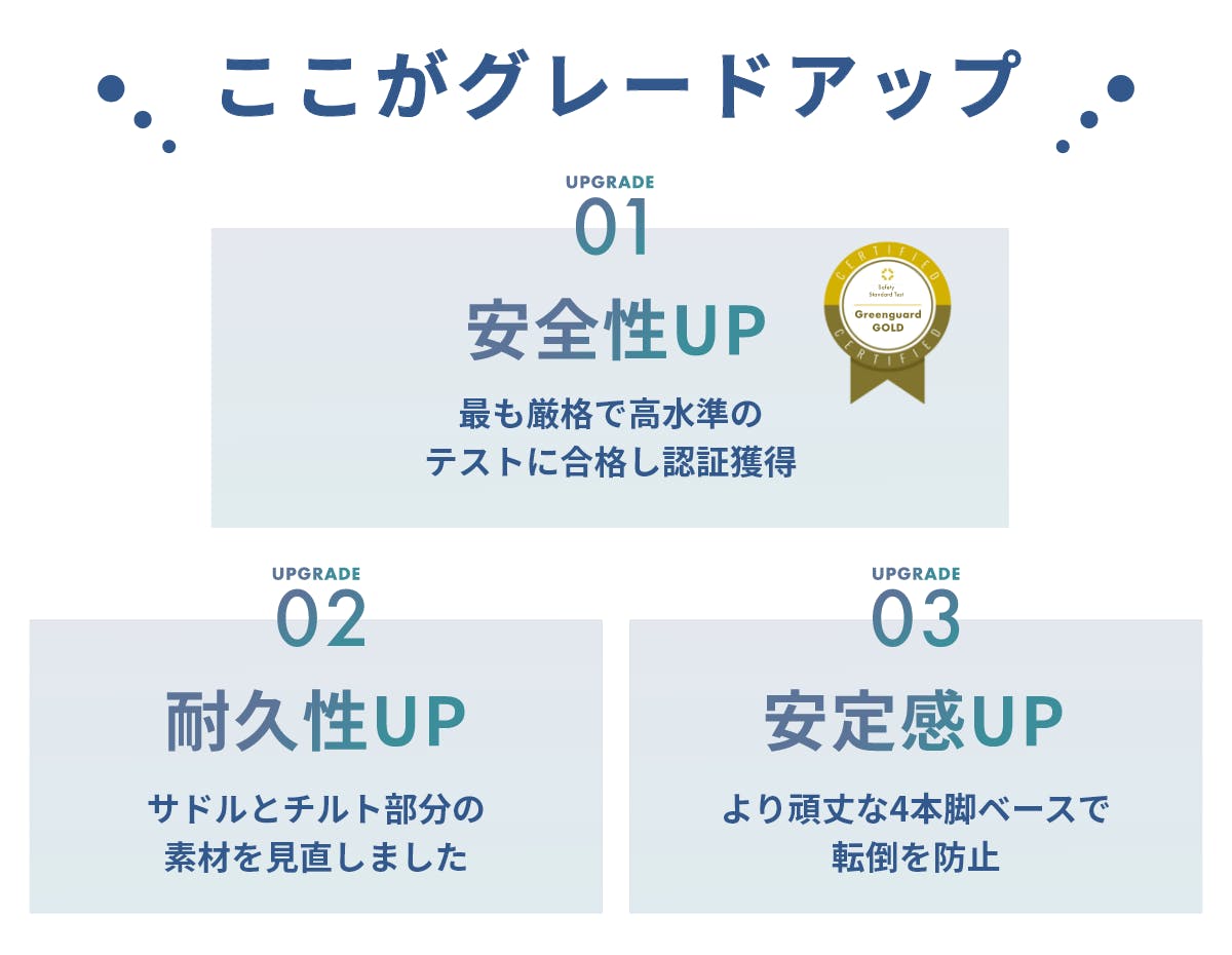 1.Greenguard GOLD認証を獲得。最も厳格な安全基準をクリアしより安全で安定感のある座り心地を追求しました。