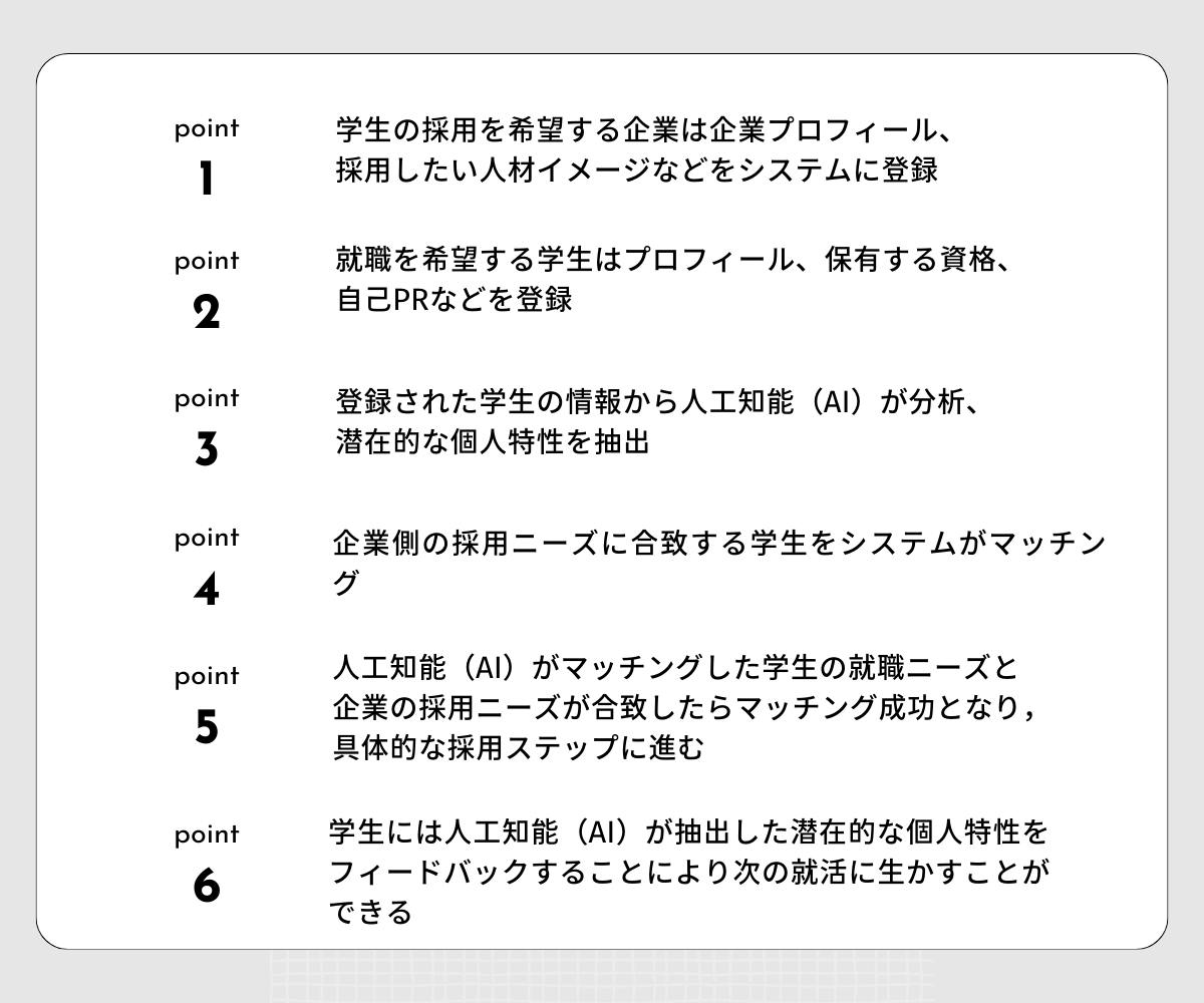 (1)どのような知識や技術を持った学生を採用したいのかを事前に登録しておくことにより、学生のニーズ(どのような知識や技術を評価して欲しいのかなど)とのマッチングを本システムのために開発した人工知能(AI)を使って行うことにより、採用後のミスマッチを回避することができます。