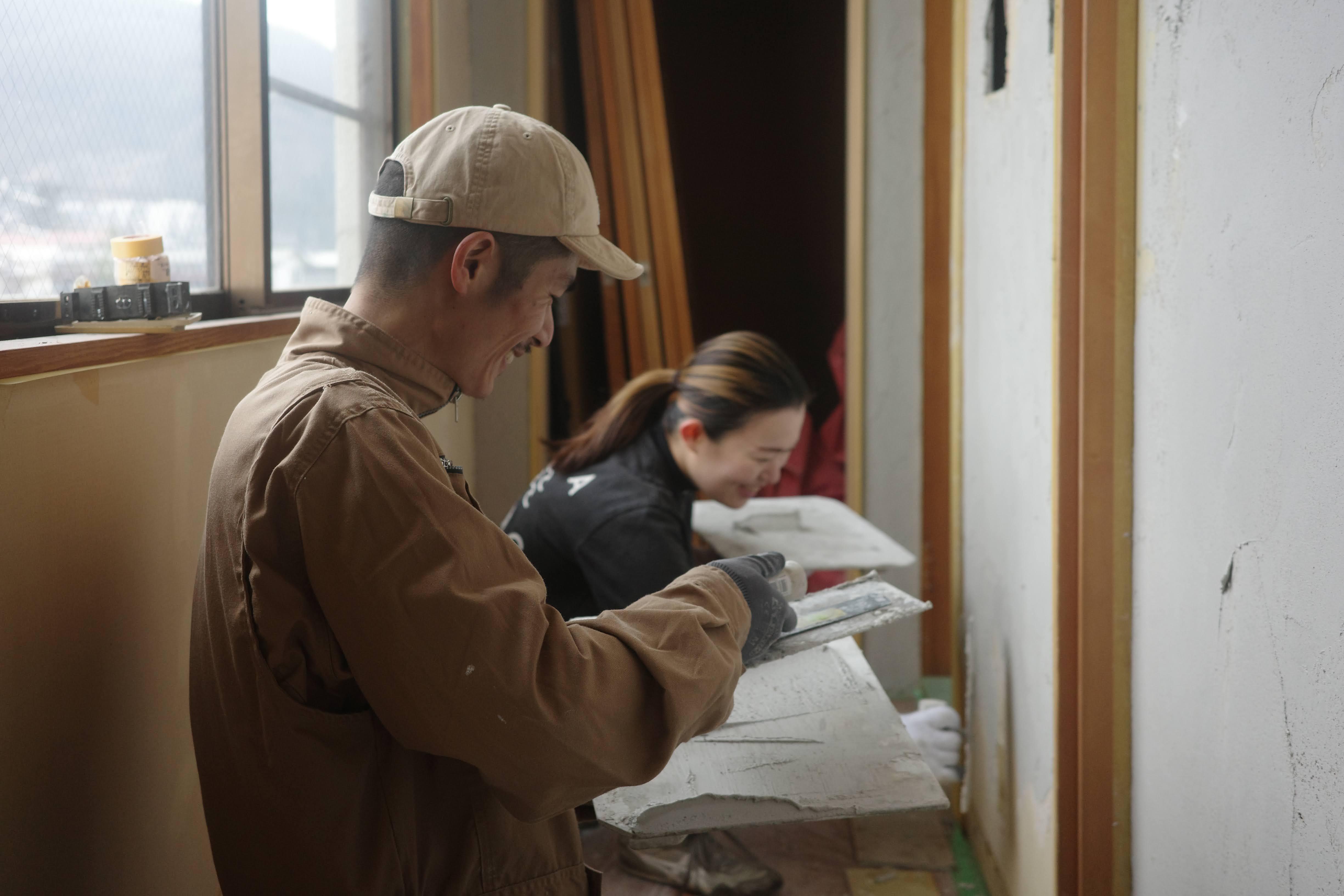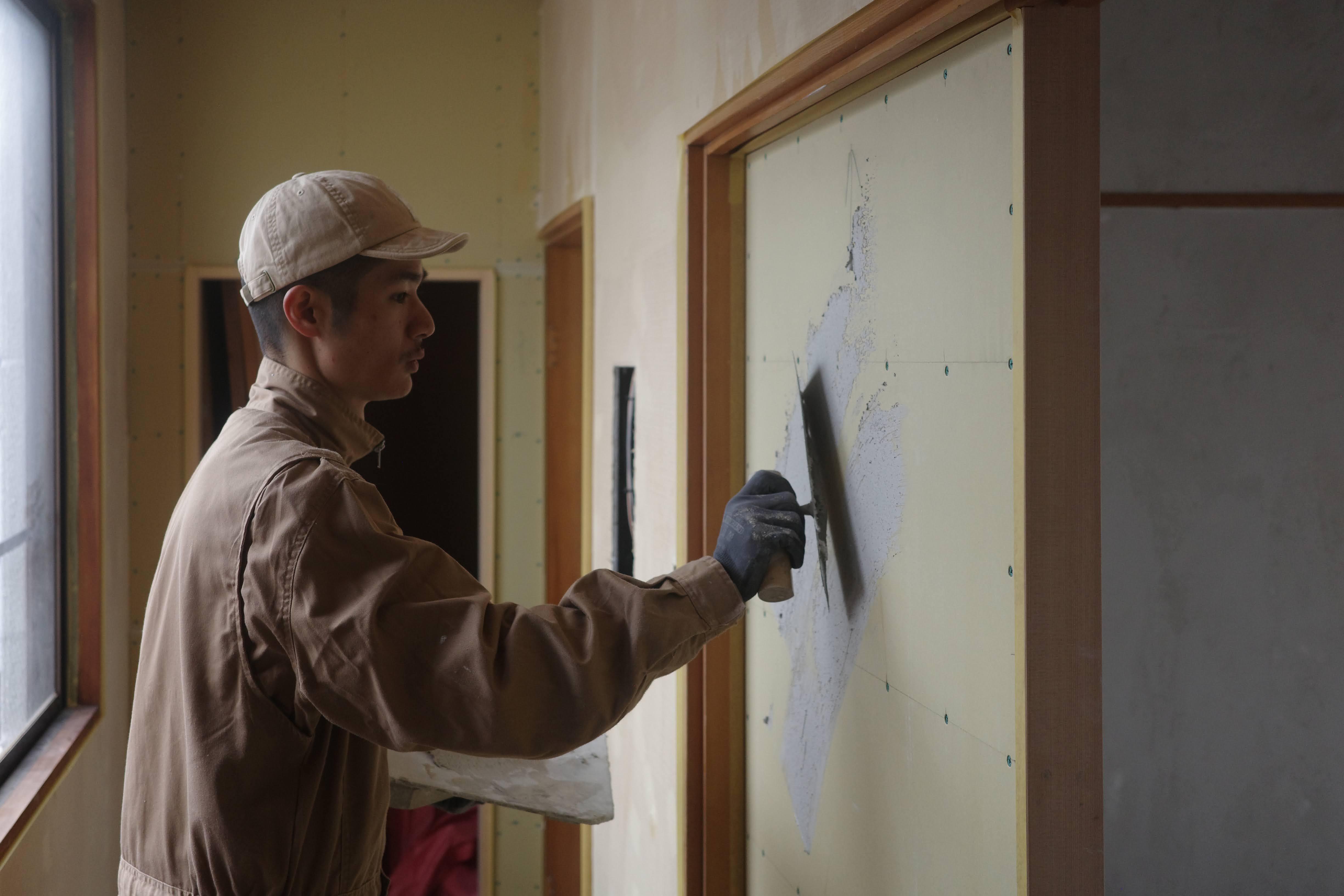 そしてホテルの壁は左官で仕上げています。諏訪でまちあるきをしているとよく出会うのですが、不思議な安心感があるんですよね。宿の左官作業には地元の方々が総勢30名ほど応援に駆けつけてくれ、すべてDIYで実施して空間づくりを進めています。
