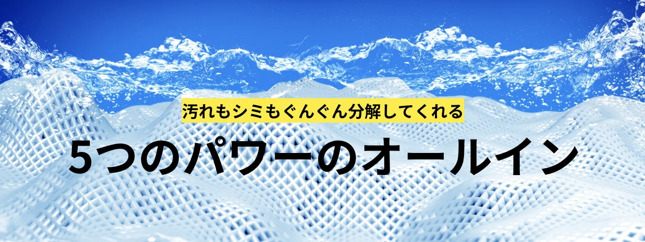 今回の開発で、「除菌力」、「脱臭力」「脱脂力」「洗浄力」、「漂白力」と5つの力を一つにした多機能線洗剤を開発することができました!