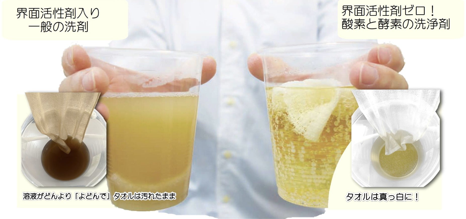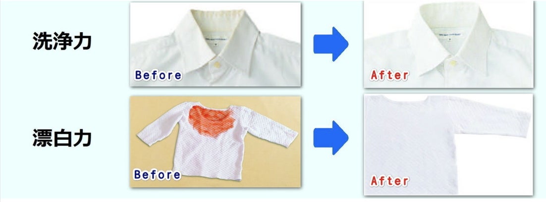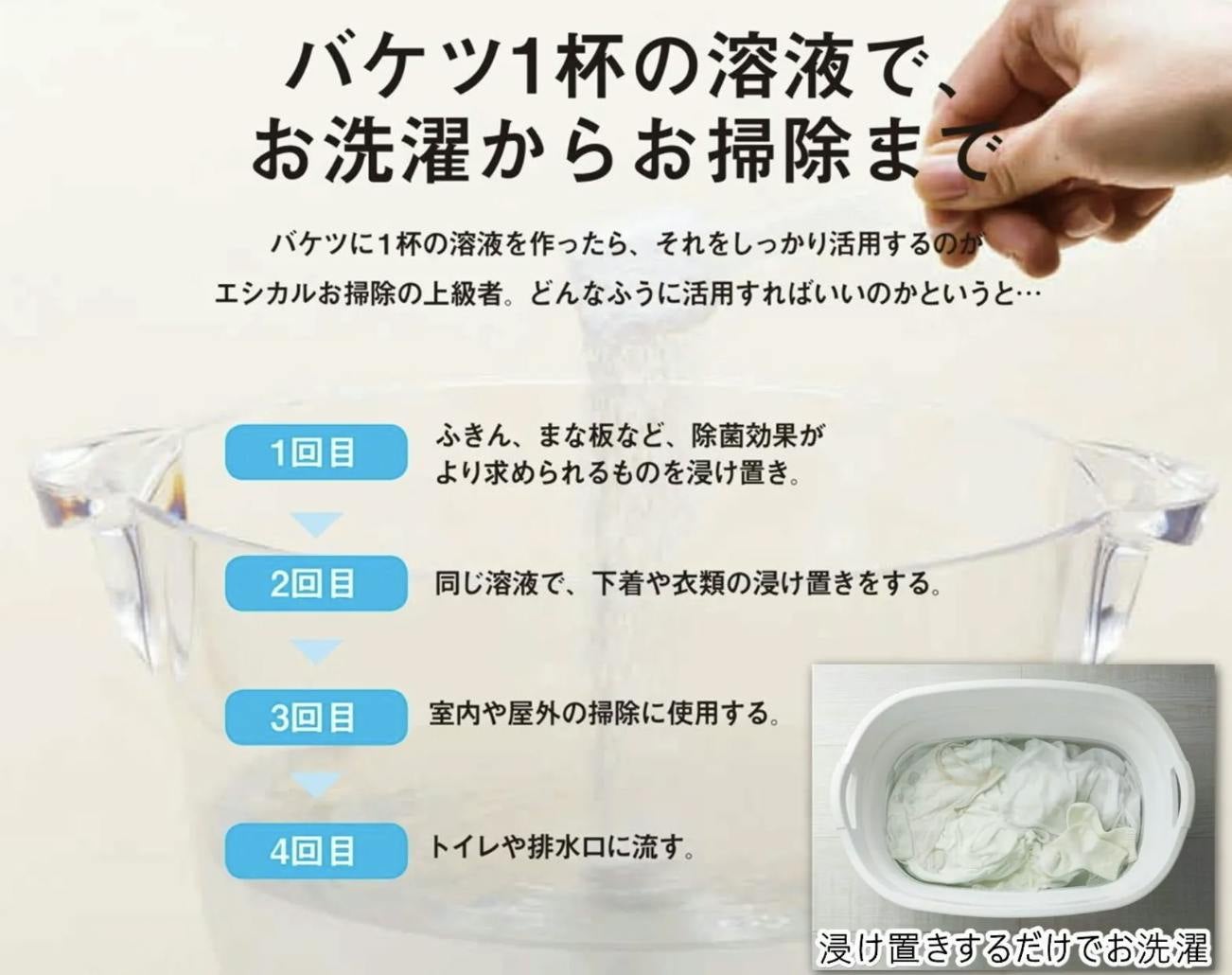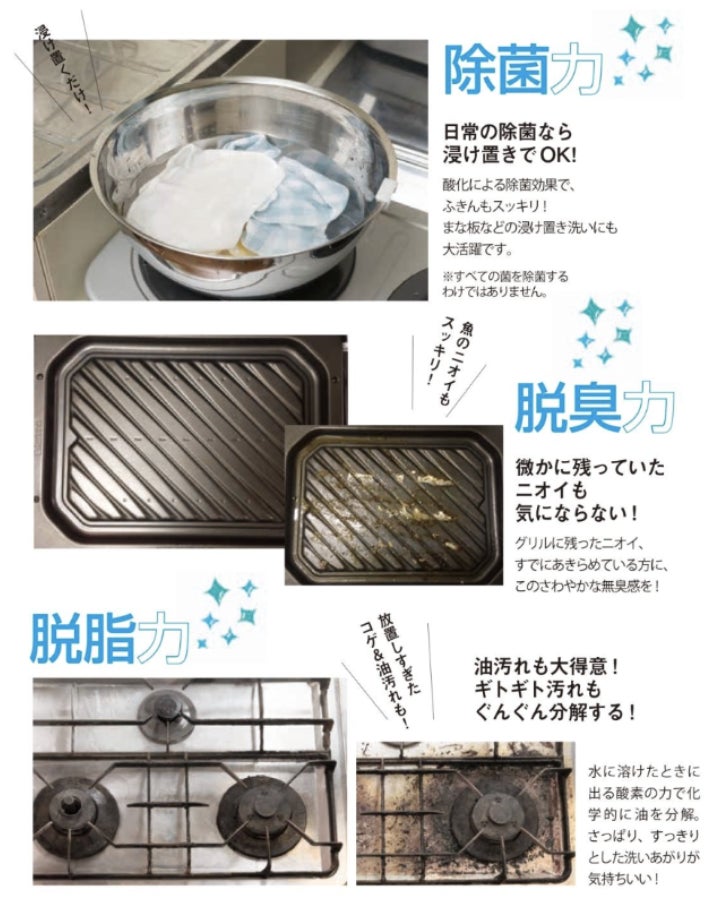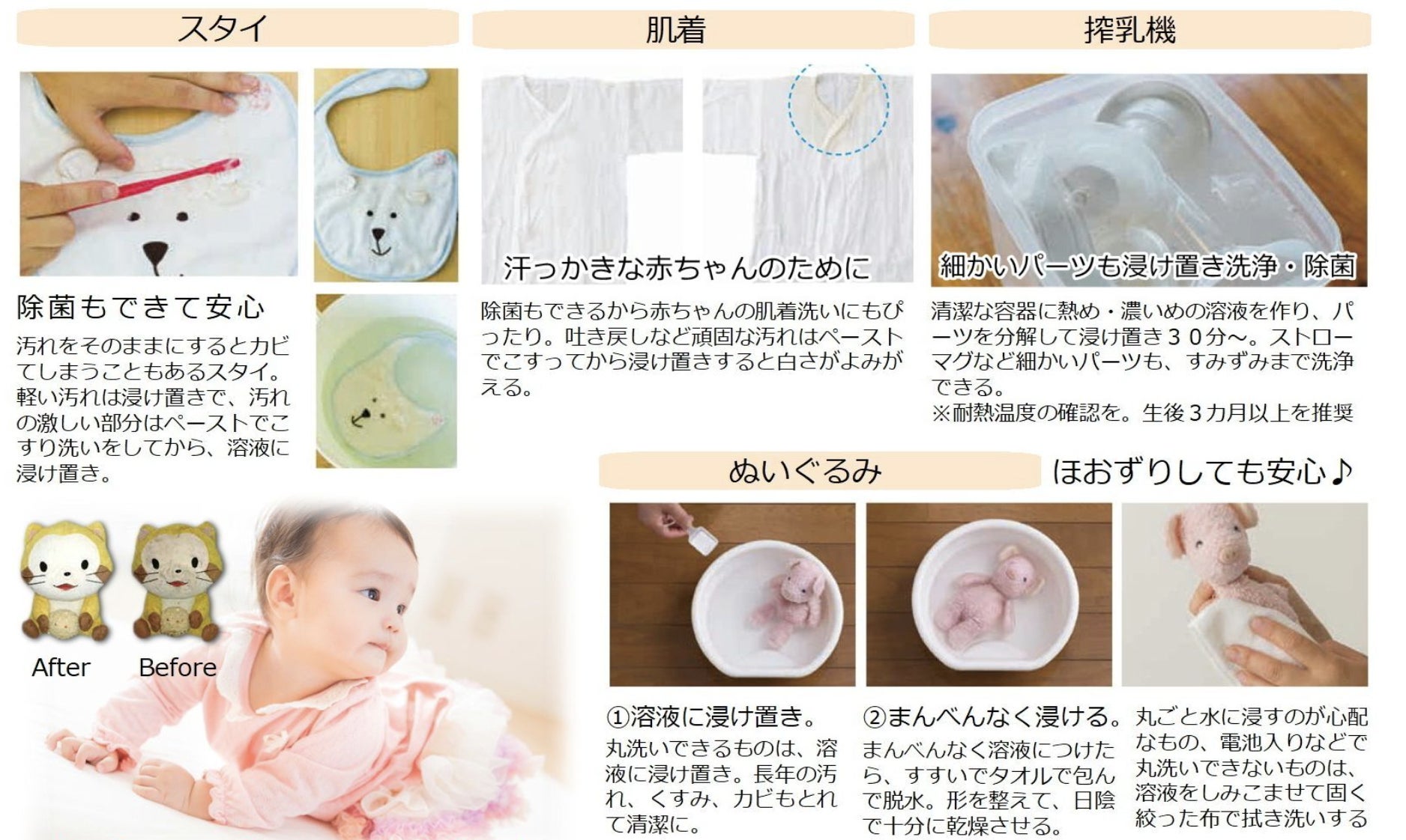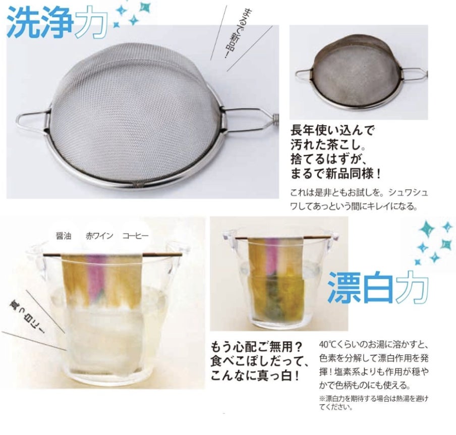 主成分は「過酸化ナトリウム」で水に反応して、炭酸ソーダになる原理を利用しており、酸素と酵素の力でつけ置きするだけとなっております。