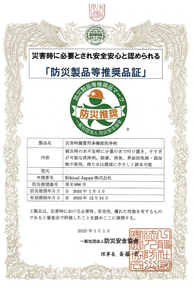 「災害時備蓄用多機能洗浄剤」は防災分野において有益な活用が可能で安全性、機能性、利便性に寄与する製品として認証されました!