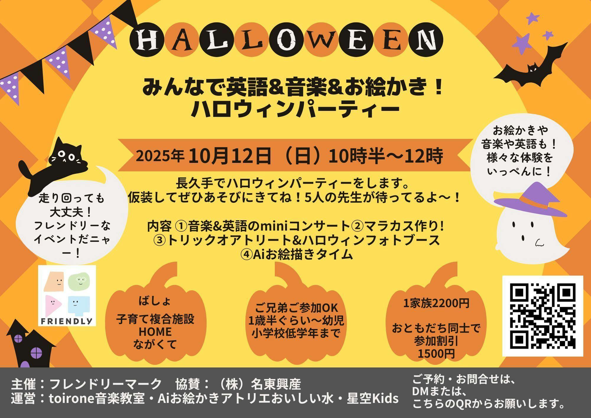 クラウドファンディングでご支援・応援をいただいた(株)名東興産様のご協賛により、Aiお絵かき・英語・音楽を一度に楽しめる「ハロウィンパーティー」を10月に開催できることになりました。