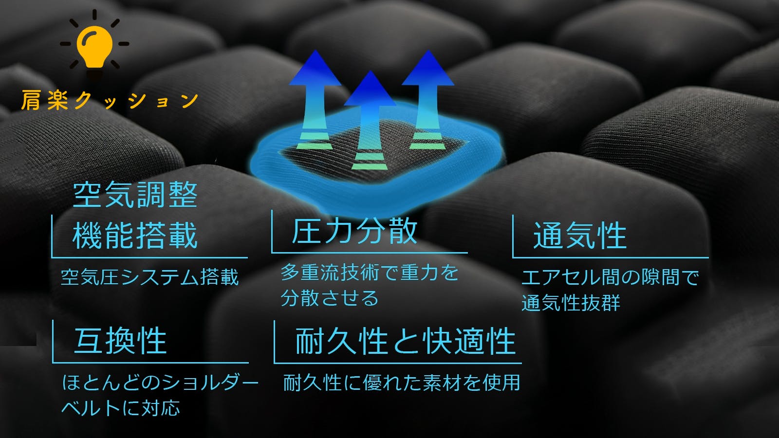 エアセルの空気を調整できる新しい仕様を採用!押すだけでいつでもどこでも簡単に空気の量を調整できます。好みに合わせたサポートが可能で、肩の負担を大幅に軽減します。