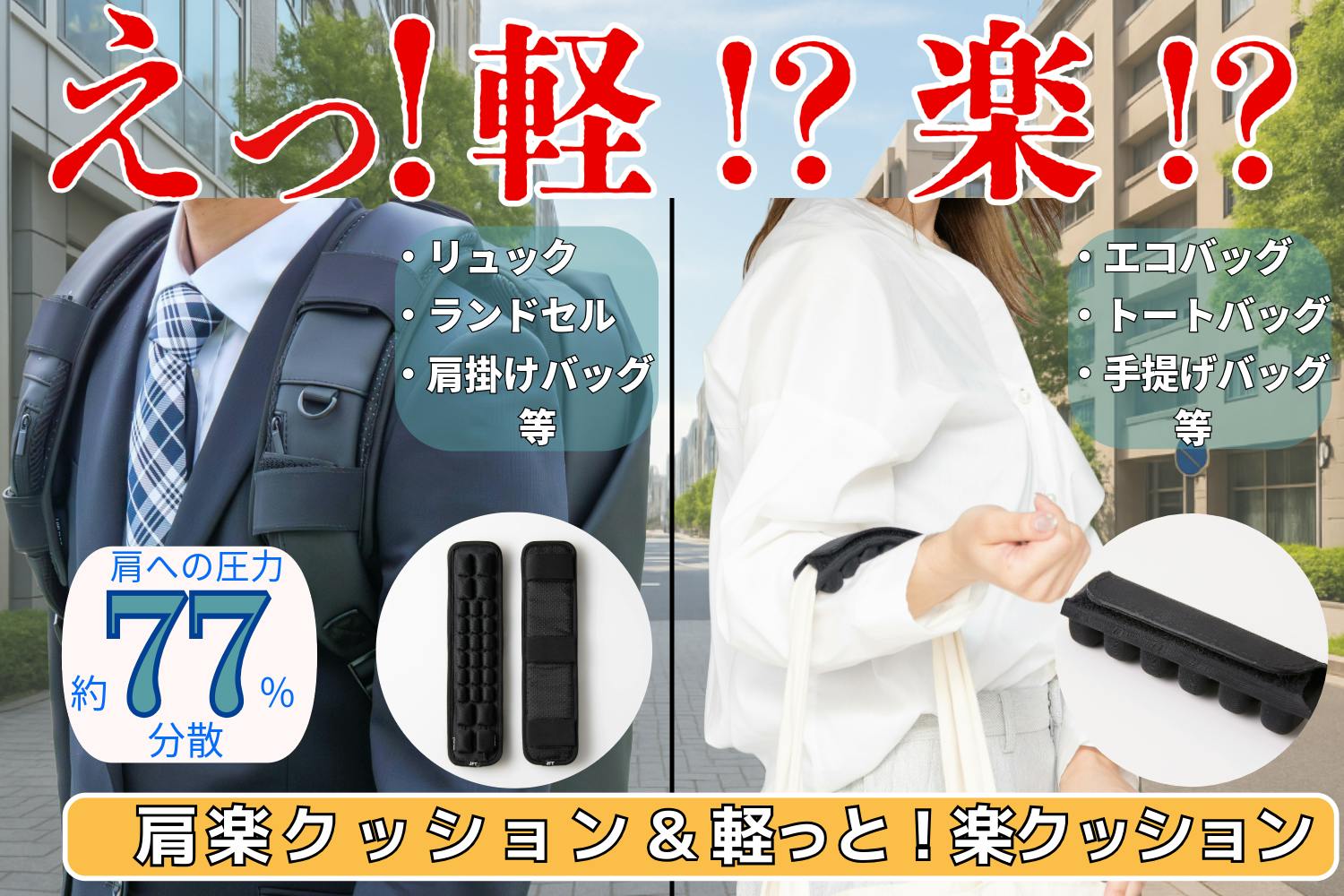 2025/06/29 18:00皆様、こんにちは!毎日の通勤・買い物で肩や腕に負担を感じていませんか?そんなお悩みに寄り添う2つの商品が登場!肩楽クッション:重いバッグの肩への負担をやわらげ、毎日を快適に。軽っと楽クッション:買い物袋の持ち手による食い込みを軽減し、手や腕を優しくサポート。どちらもエアクッションの力で、体の負担を軽く、気分も軽やかにこのプロジェクト残り1日!是非、応援よろしくお願いいたします! もっと見る