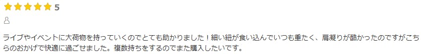 「ライブやイベントに大荷物を持っていくのでとても助かりました!細い紐が食い込んでいつも重たく、肩こりが酷かったのですが、こちらのおかげで快適に過ごせました。複数持ちをするので、また購入したいです。」