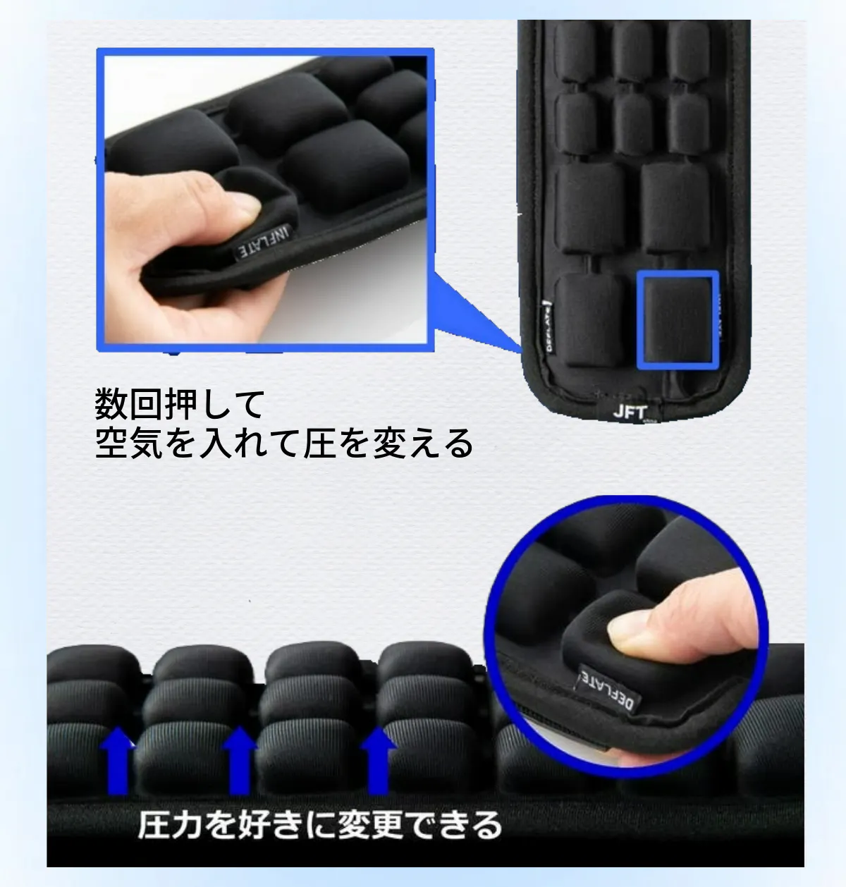 当社の理念は、JFT(Just Future Technology) です。近未来の技術で人々の人生を楽しく、豊かに日々健康でカラダストレスフリーな未来を創りあげ、健康長寿の世の中に貢献していきます。エアクッションアイテムを通じて、多くの方の悩みを解決できれば幸いです。これからも、お客様の生活を豊かにする価値ある製品を創造してまいります。
